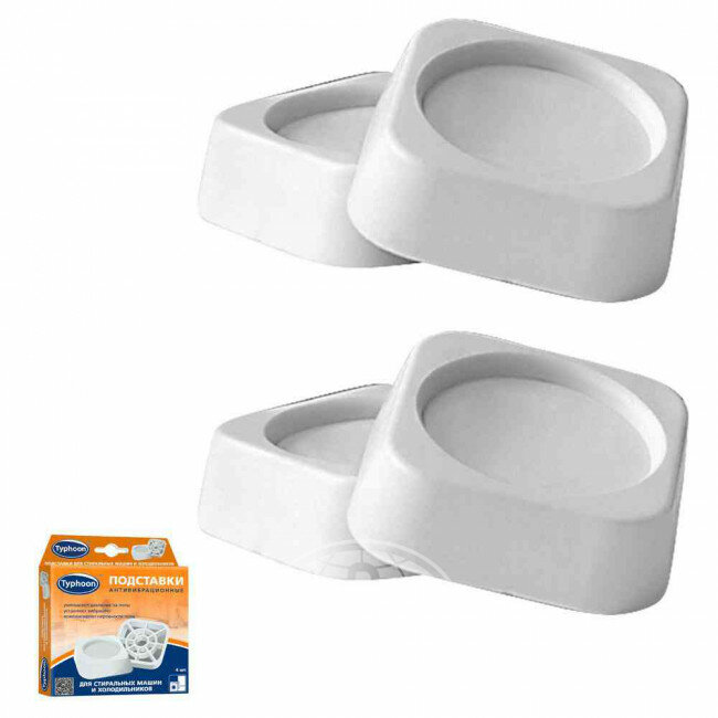 Подставки для стиральных машин антивибрационные Тайфун выполнены в белом цвете. Это делает их абсолютно незаметными. Никоем образом влиять на общий интерьер они не будут. В наборе имеется четыре штуки. Их использовать можно всего лишь на одном приборе. Высокие показатели прочности и надежности позволяют служить им на протяжении длительного периода времени. Крепятся подставки к основанию стиральной машинки довольно легко.