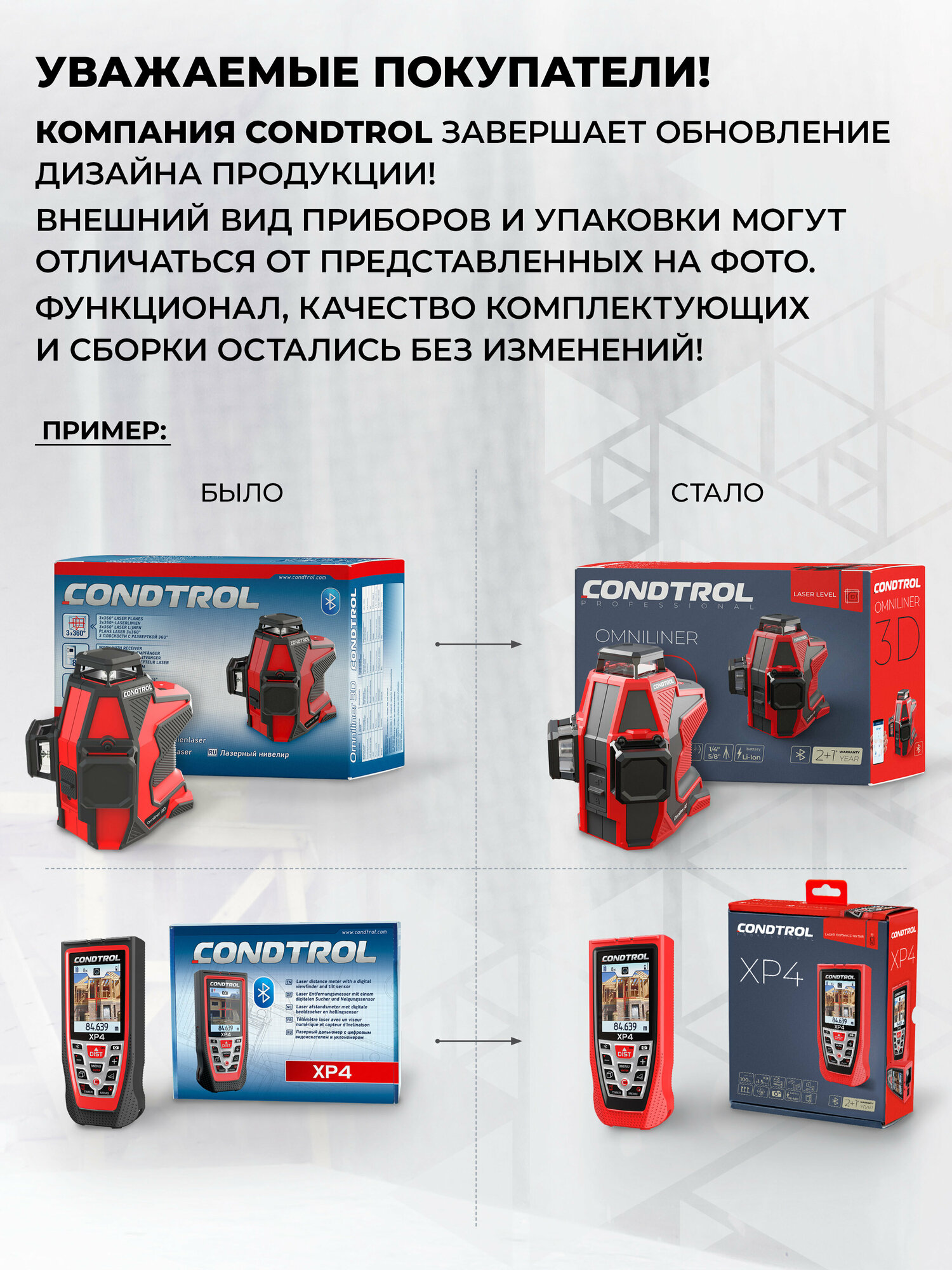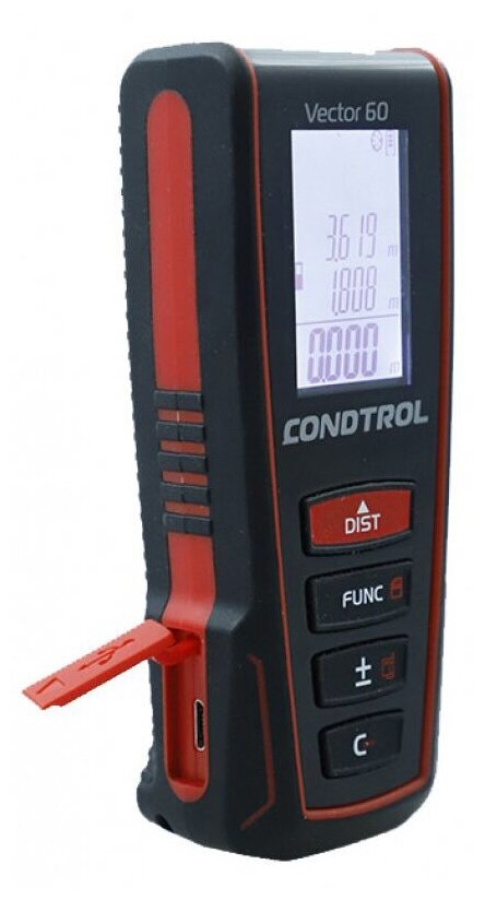 | Прочие особенности | Оптимальный набор функций. Дальномер CONDTROL Vector 60 выполняет автоматические вычисления площади, объёма, сложение и вычитание. Для проведения замеров в труднодоступных местах дальномер имеет функцию косвенных вычислений по теореме Пифагора. У лазерной рулетки CONDTROL Vector 60 также есть функция трекинга., Встроенный Bluetooth. CONDTROL Vector 60 может передавать результаты измерений в смартфон или планшет. Достаточно скачать c Google Play или App Store бесплатное приложение CONDTROL Smart Measure. С помощью этой программы у пользователя появляется масса возможностей:, – можно хранить в памяти смартфона неограниченное число измерений;, – фотографировать объекты, помещения, декор, мебель и наносить размеры на них, делать ремарки, комментарии, что по достоинству оценят архитекторы, дизайнеры, декораторы;, – рисовать планы помещений с размерной сеткой;, – сохранять и экспортировать полученные файлы, что значительно упрощает работу строителей, дизайнеров, изготовителей мебели и т.д., Защищённый корпус. Эргономичная форма лазерной рулетки CONDTROL Vector 60 и рельефная поверхность обеспечивают надёжный обхват прибора. Герметичность корпуса по стандарту IP54 позволяет пользоваться CONDTROL Vector 60 в условиях стройплощадки. Дальномер имеет четыре кнопки управления, которые удобно нажимать даже в перчатках., Откидная пятка и крепление на штатив. Расстояние может измеряться с передней или задней стенки корпуса, со штатива, откидной скобы. Откидная скоба даёт возможность проводить точные замеры из углов и труднодоступных мест., Li-ion аккумулятор. Современные технологии стремительно интегрируются в измерительную технику. Теперь у дальномеров нет батарейного отсека, благодаря чему повышается жесткость корпуса и степень пылевлагозащиты. Ресурс аккумулятора удивляет своей производительностью. Одного часа зарядки достаточно, чтобы сделать несколько сотен измерений., Лазерная рулетка CONDTROL Vector 60 пригодится строителям, отделочникам, монтажникам, замерщикам окон, установщикам мебели, домашним мастерам. С помощью дальномера вы легко сможете рассчитать необходимое количество отделочных материалов для ремонта, измерить площадь квартиры или дома при покупке жилья и т.д. |