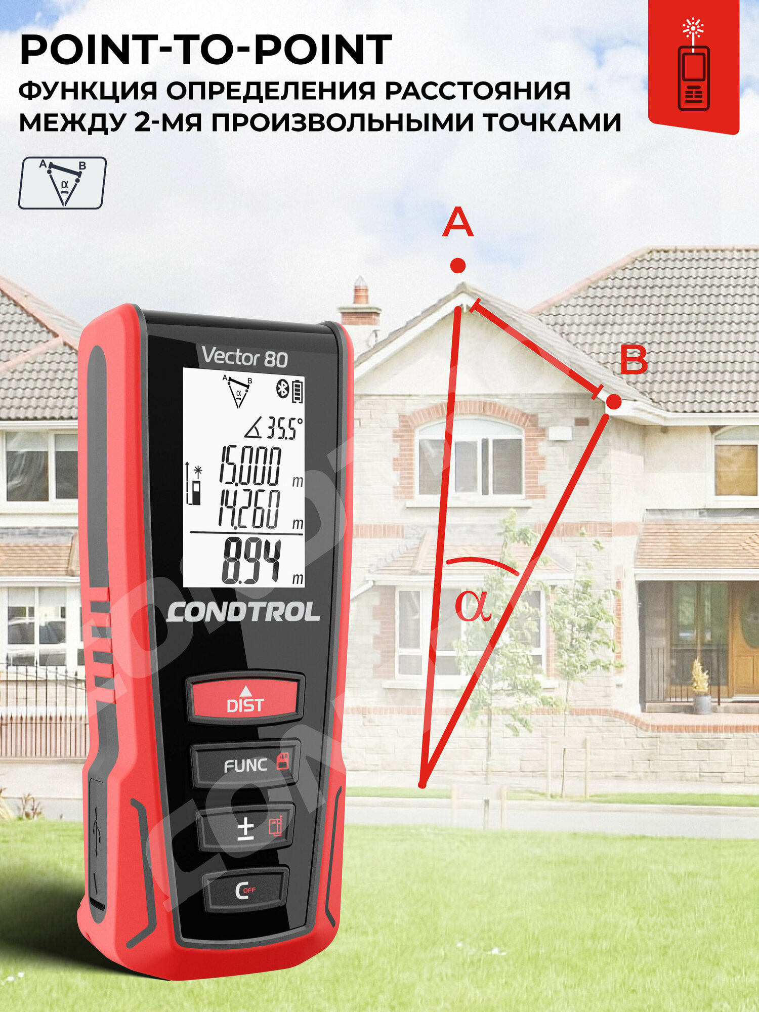 Функция Point-to-Point. Лазерная рулетка CONDTROL Vector 80 может измерять расстояние между двумя произвольными точками в пространстве, благодаря встроенному 3D- акселерометру. Таким образом, вы сможете всего по двум замерам определить длину отрезка, проходящего сквозь здания или препятствия (стена, деревья, забор).