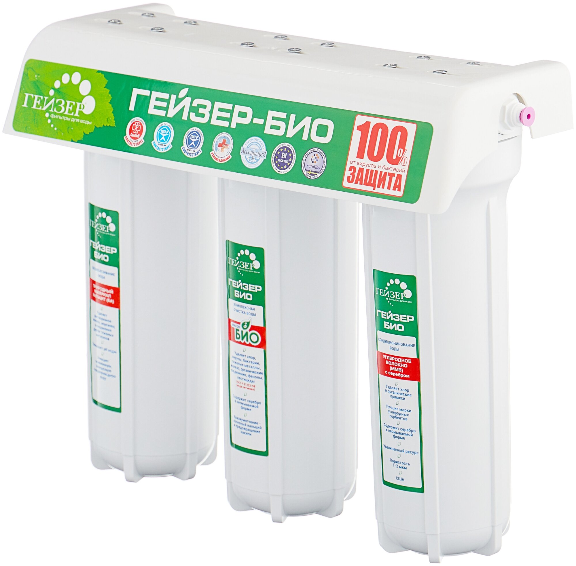 Фильтры Гейзер-Био удаляют все бактерии и вирусы, очищают воду от вредных примесей, хлора, тяжелых металлов, нитратов, пестицидов, взвешенных частиц, избытка солей жесткости и корректируют ее минеральный состав.