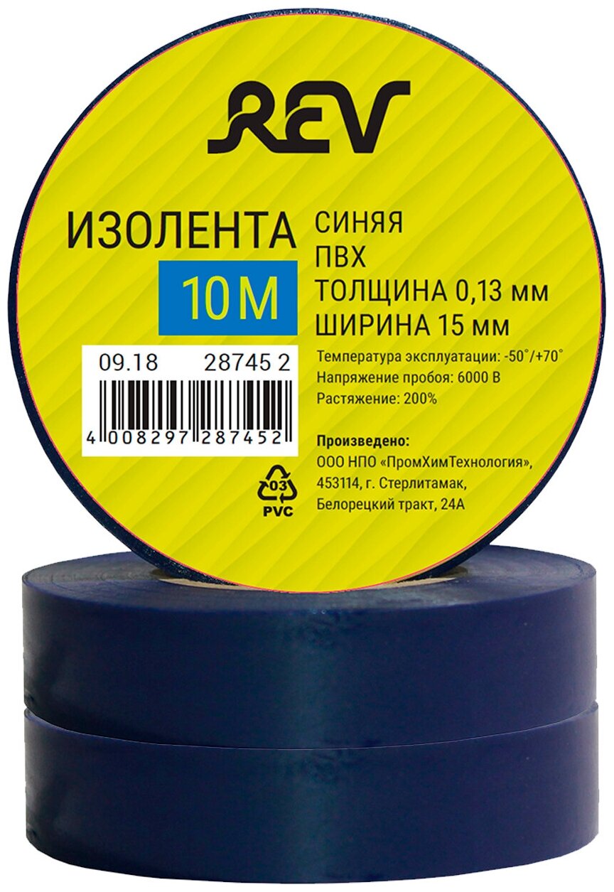 Модель: Изолента ПВХ REV 10 м синяя 15 мм