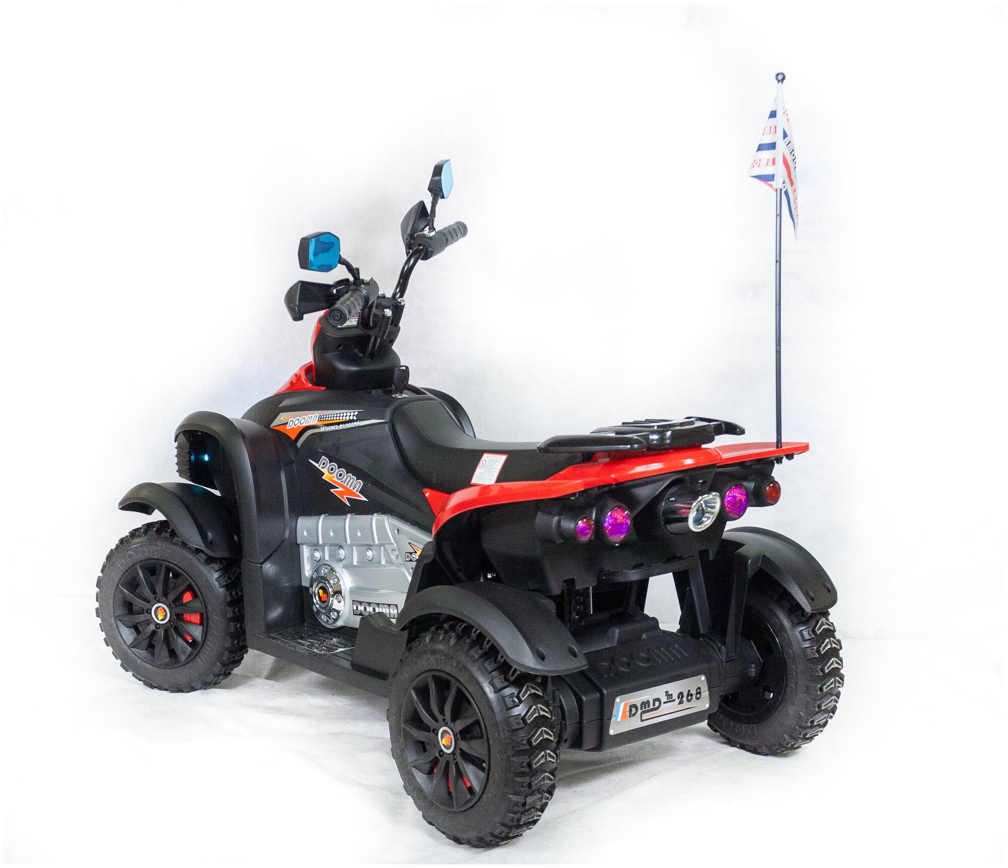 Детский электроквадроцикл 268A для детей от 3 года до 8 лет. Большие резиновые колеса с подкрылками, максимальная нагрузка 35 кг. Аккумулятор 12V/10Ah, два двигателя: 2x35W. Амортизаторы на передних и задних колесах для плавности хода — максимальная скорость 7 км/ч, скорость вперед, одна скорость движения назад. Заводится с ключа. Нет пульта ДУ. Пластиковое сиденье, без ремней безопасности. Музыкальные эффекты на корпусе (кнопка клаксона и проигрывания мелодий). Разъем для подключения MP3, вход для карты SD, вход для USB и мини USB, FM-радиоприёмник. Светодиодные огни фар, свет фонарей.