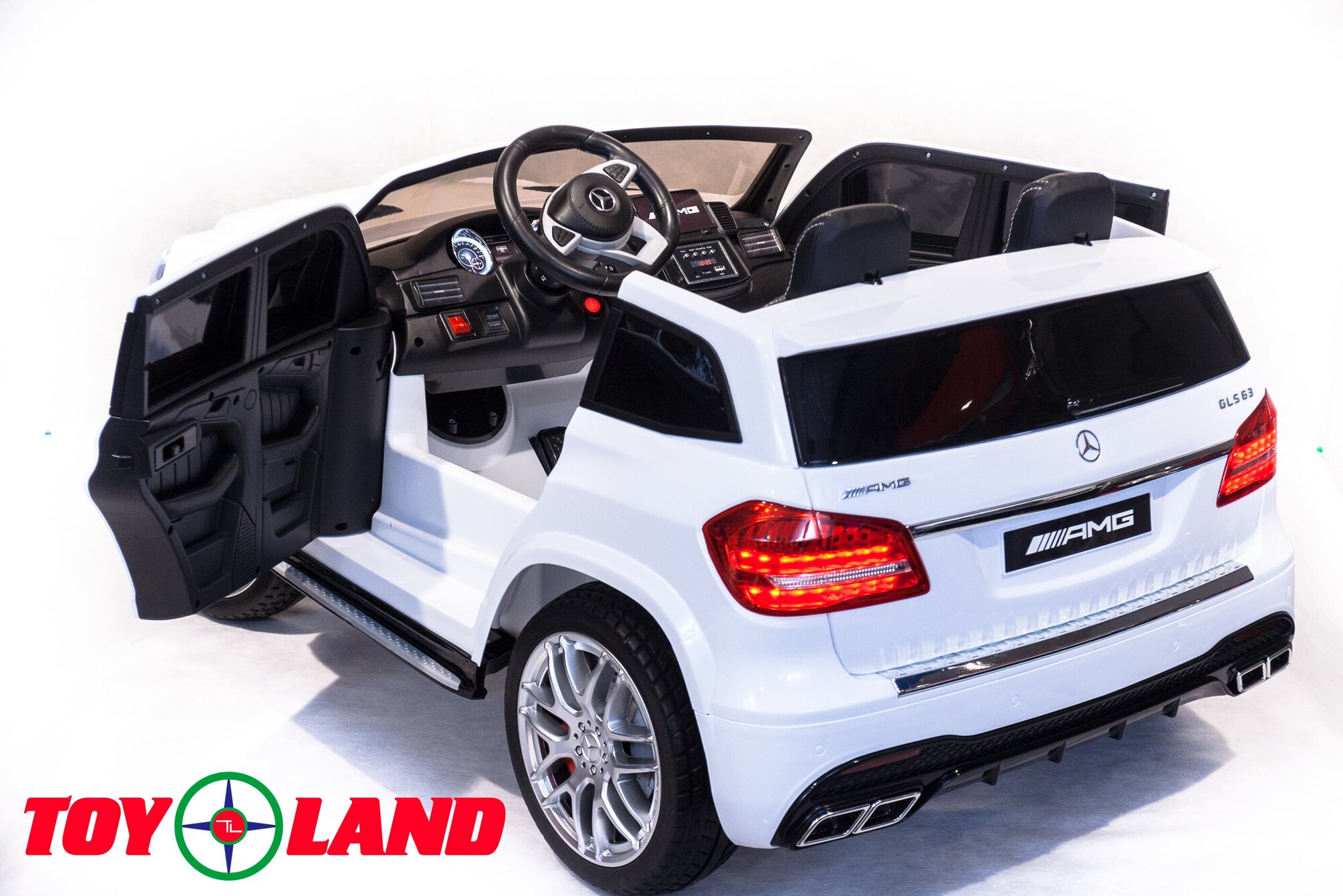 Детский электромобиль Mercedes-Benz GLS63 AMG для детей от 3 лет, двухместный (руль смещен в левую сторону для удобства водителя). Большие полностью резиновые колеса EVA, максимальная нагрузка 35 кг. Аккумулятор 2Х12V/7Ah, четыре двигателя: 4x35W,полный привод 4Х4. Амортизаторы для плавности хода. Максимальная скорость 8 км/ч, 3 скорости вперед, одна скорость движения назад (переключение скоростей - с пульта ДУ или плавный набор скорости с помощью педали). Открываются двери, 2 отдельных кожаных (52 см общая) сиденья с ремнями безопасности. Удобный руль с музыкальными эффектами (кнопка клаксона и проигрывания мелодий). Разъем для подключения MP3, вход для карты SD, вход для USB, встроенный FM-радиоприемник. Светодиодные огни фар и задних сигналов. В комплекте: аккумулятор, зарядное устройство, пульт дистанционного управления (работает по bluetooth, радиус действия до 30 метров).