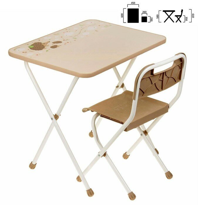 Комплект складной. Подходит для кормления, игр и обучения. Поверхность столешницы ламинированная с нанесением ярких познавательных рисунков. На поверхности стола можно рисовать маркером на водной основе. Размер столешницы 600х450 мм. Высота стола 580 мм. Размер сиденья стула 260х290 мм. Высота до сиденья 350 мм. Высоты спинки стула 610 мм.