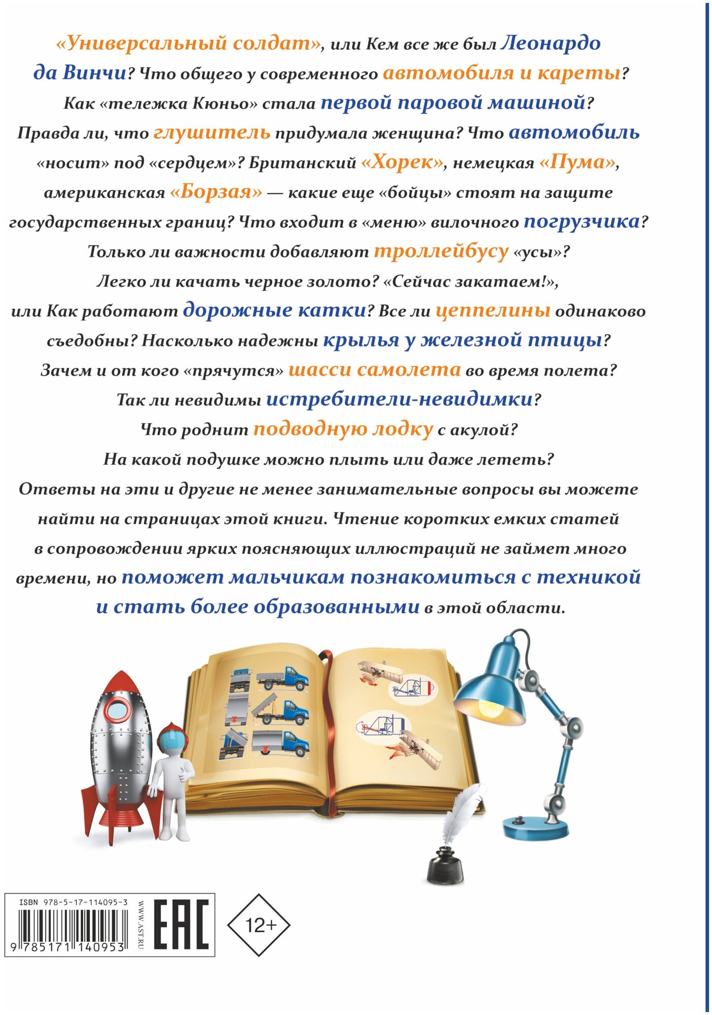 Как современным мальчикам стать образованными в такой необходимой для каждого из них теме, как техника? Нужен надежный проводник в море технической информации, например как эта книга, составленная в виде конспекта-справочника. Именно здесь юные всезнайки найдут ответы на большинство своих вопросов, касающихся техники. Что заставило древнего человека придумать колесо? Где в автомобиле "прячутся" лошадиные силы? Так ли безопасна подушка безопасности? Легко ли качать черное золото? Эскалатор и экскаватор - кто возит, а кто копает? Что роднит подводную лодку с акулой? Что общего у неваляшки и парусного корабля? "Универсальный солдат", или Кем все же был Леонардо да Винчи? И наконец, вечный двигатель - миф ли реальность? Ответы на эти вопросы и множество других полезных знаний о технике, которыми должны обладать образованный мальчики, содержатся на страницах данного прекрасно иллюстрированного издания.