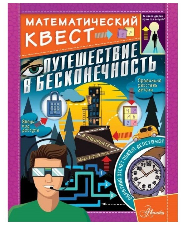 Путешествие в бесконечность. Фиолетовая книга — самая страшная и самая сложная. Нужно спасти профессора, похищенного злодеями. А они тут на каждом шагу. И такими мерзкими нарисованы, что просто жуть. Шлем виртуальной реальности помогает нам обнаружить профессора. Из него выкачивают мозги! Слава богу, что преступников удается остановить, потому что освобожденный профессор сразу же принимается загадывать математические загадки своему спасителю. А дальше побег, погоня, преследователи и просто огромное количество довольно сложных головоломок. Хорошо, что всё хорошо кончается. Все головоломные задания в этой книге так или иначе связаны с числами: делимость, кратность, четность, последовательности. А еще нужно будет группировать эти самые числа по определенным условиям, решать числовые ребусы и не только. В общем, скучать вам точно не придется.