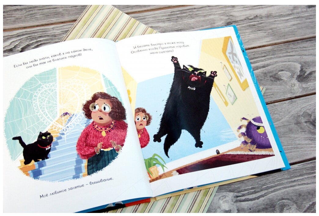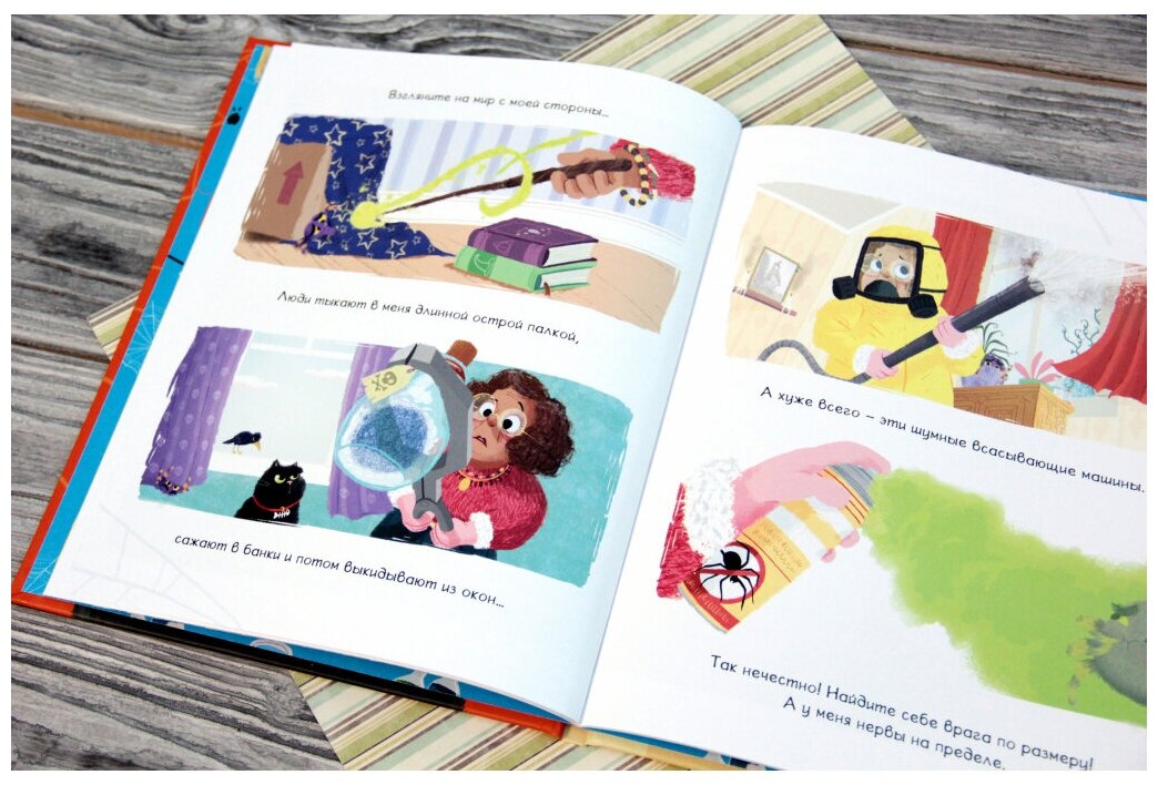 Вчера были в магазине, и сын сам нашел эту книгу и потребовал купить – очень любит всяких жучков-паучков и насекомых. Прочитали быстро, текста немного – но иллюстрации очень крупные, красочные, яркие. На каждой странице можно потренировать внимательность и поискать паука. История поучительная – не суди по первому впечатлению. Полезная книга.