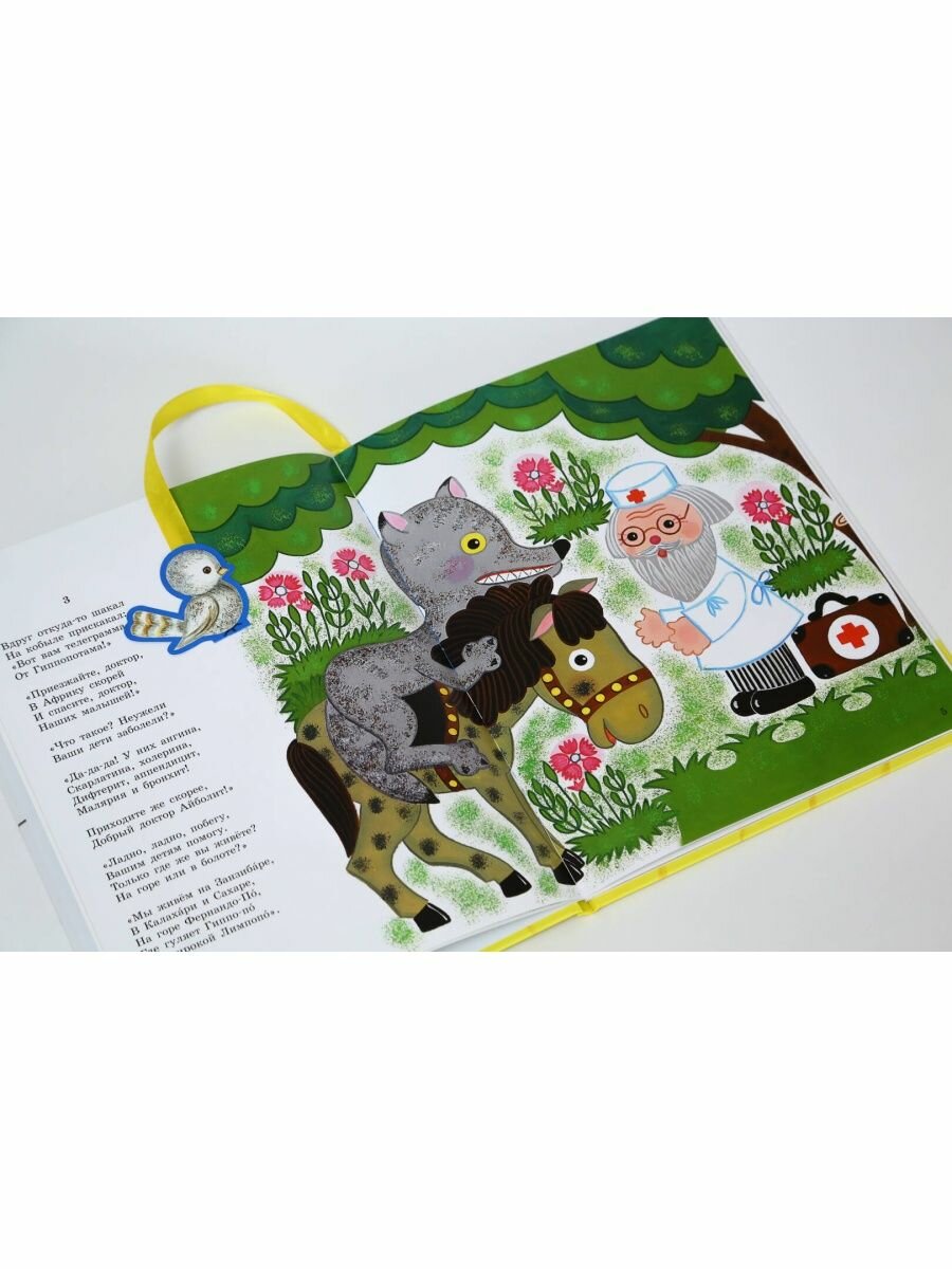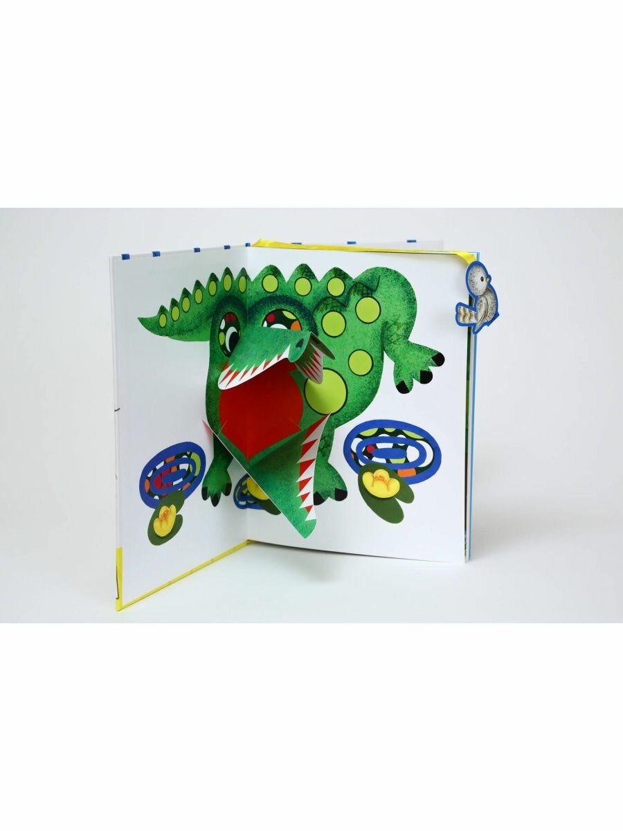 На форзацах книги объёмные, двигающиеся элементы. В начале - крокодил и легендарный воробей на верёвочке. В конце - слон, который очень любил есть морковку.