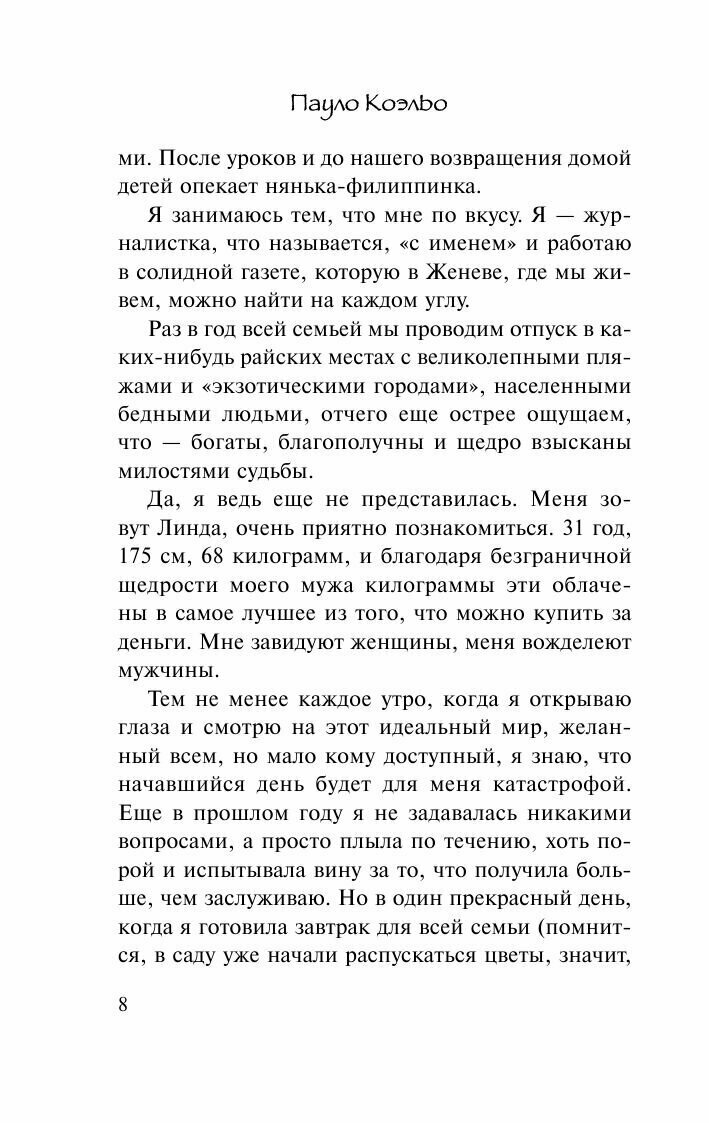 Книга моего любимого Коэльо! Я читаю их , независимо от всех, чтобы насладиться его взглядом на мир, его мастерством сюжета... И эту книгу купила так же не глядя!). Автор как всегда меня порадовал, и прежде всего философским объяснением природы Адюльтера, именно для женщины ... Поэтому вывод- ЧИТАТЬ!