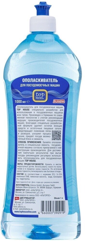 Ополаскиватель для посудомоечных машин Top House поставляет в пластиковой бутылке объемом в один литр. Все правила и требования по его применению описаны на упаковке. Данная информация позволит грамотно использовать средство по назначению. Стоимость ополаскивателя не потребует больших затрат. Товар имеет сертификаты качества. Чистота и безупречный внешний вид посуды однозначно гарантированы. Данное приобретение оправдает себя вне всяких сомнений.