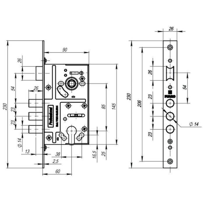 Корпус врезного цилиндрового замка Fuaro V10/C-60.00.3R14 с тремя ригелями и защелкой предназначен для установки во входные и технические металлические двери. Стальной оцинкованный корпус. Универсальная реверсивная защелка, подходит для левых и правых дверей. Отверстия под стяжные винты. Размер бэксета- 60 мм. Выход ригелей- 26 мм. Диаметр ригелей -14 мм. Открывание-2 полуоборота.