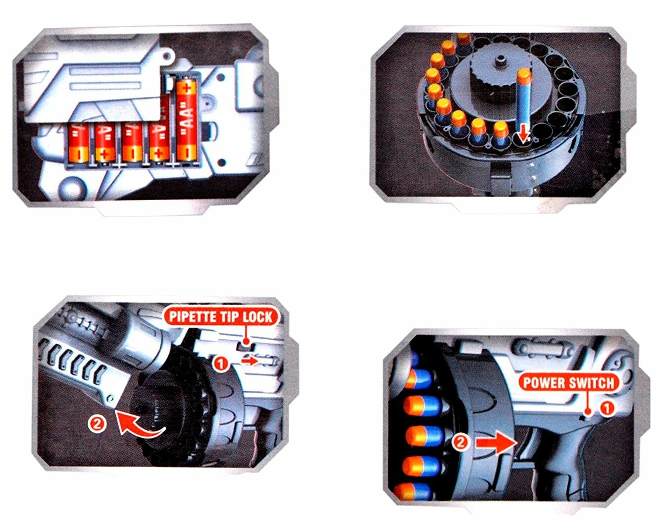 Электрифицированный бластер с мягкими пулями - прекрасный подарок для маленького супергероя! Патроны устанавливаются в барабан, расположенный посередине игрушки. Выстрел осуществляется нажатием на курок. В комплект входит 40 мягких пуль из поролона с круглыми наконечниками и с наконечниками-присосками (по 20 штук каждого вида).