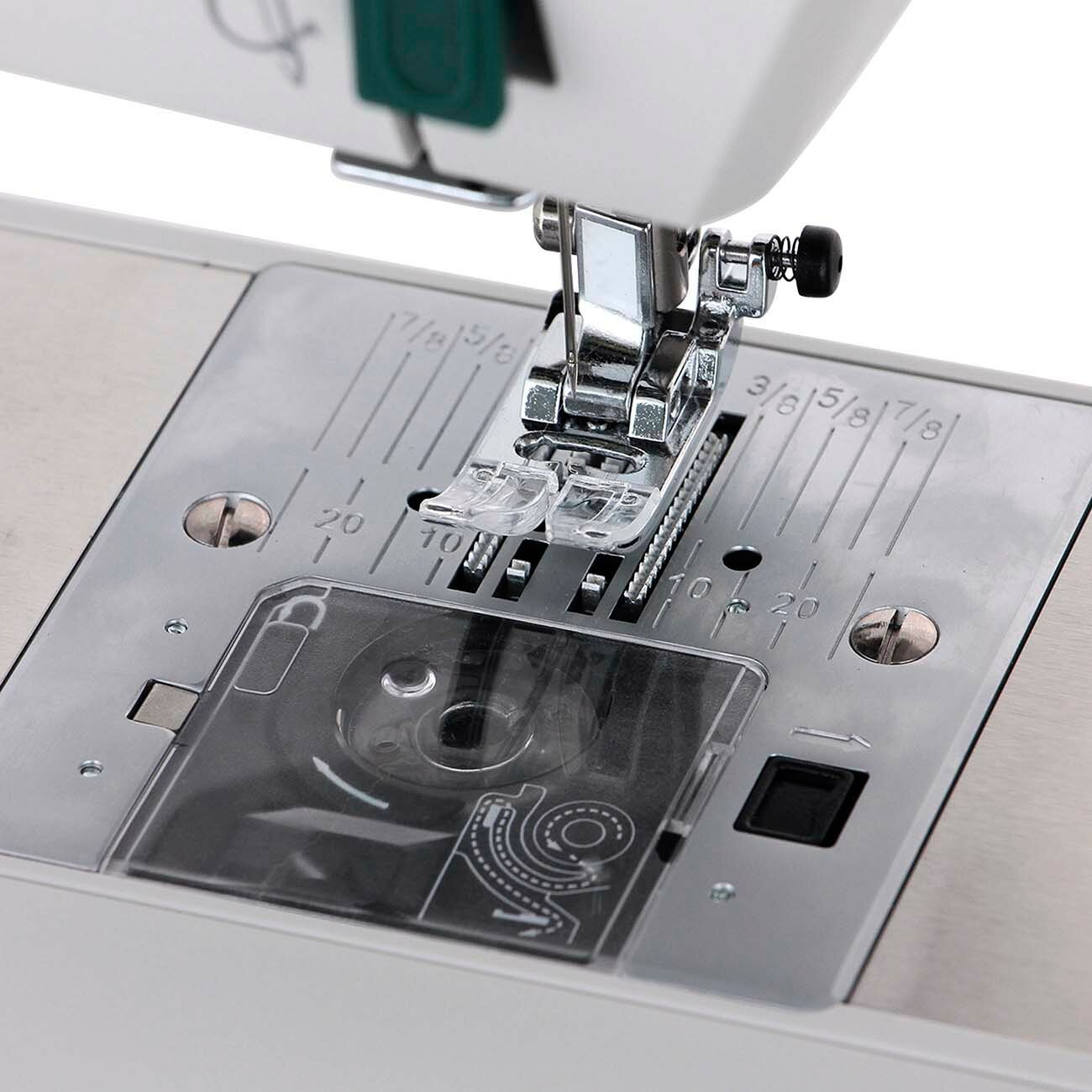 Прибор оснащен несколькими видами регулировки – давления лапки, натяжения нити, отключения нижнего транспортера. Есть подсветка для освещения рабочей поверхности при слабом источнике света. Габариты – 40х29х17 см, масса – 6,7 кг.
