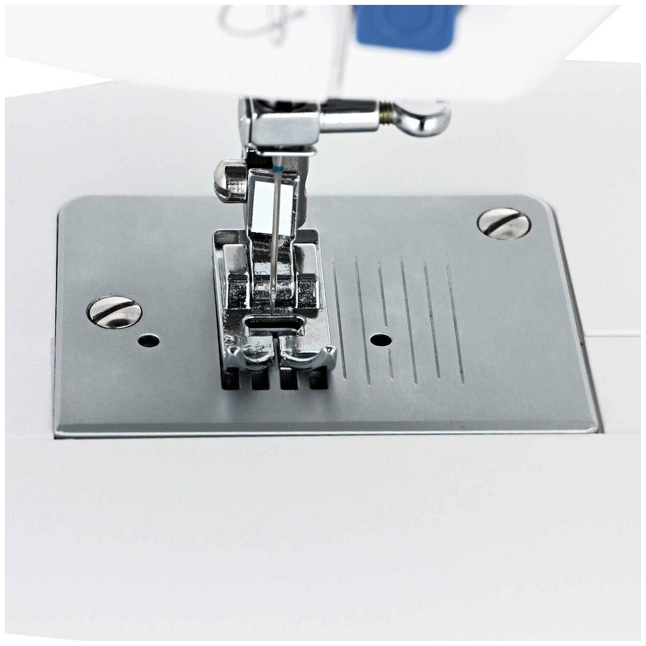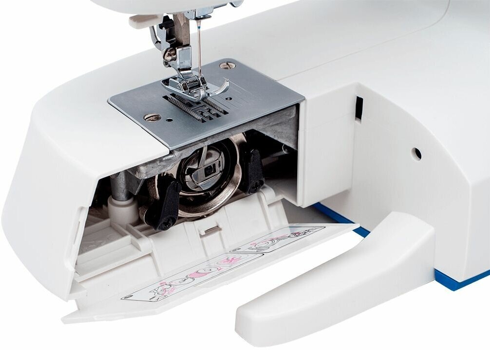 Корпус выполнен из пластика, устойчивого к механическим повреждениям. Для хранения дополнительных аксессуаров предусмотрен специальный отсек. В комплекте поставляются лапка для выметывания петли и лапка для вшивания молнии.
