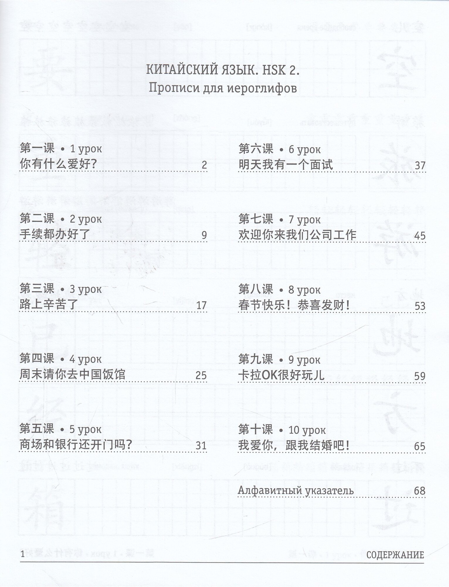 Каждый иероглиф имеет перевод, транскрипцию с тоном, а также порядок черт. В конце прописей расположен алфавитный указатель. Прописи можно использовать как на занятиях в группах, так и индивидуально.