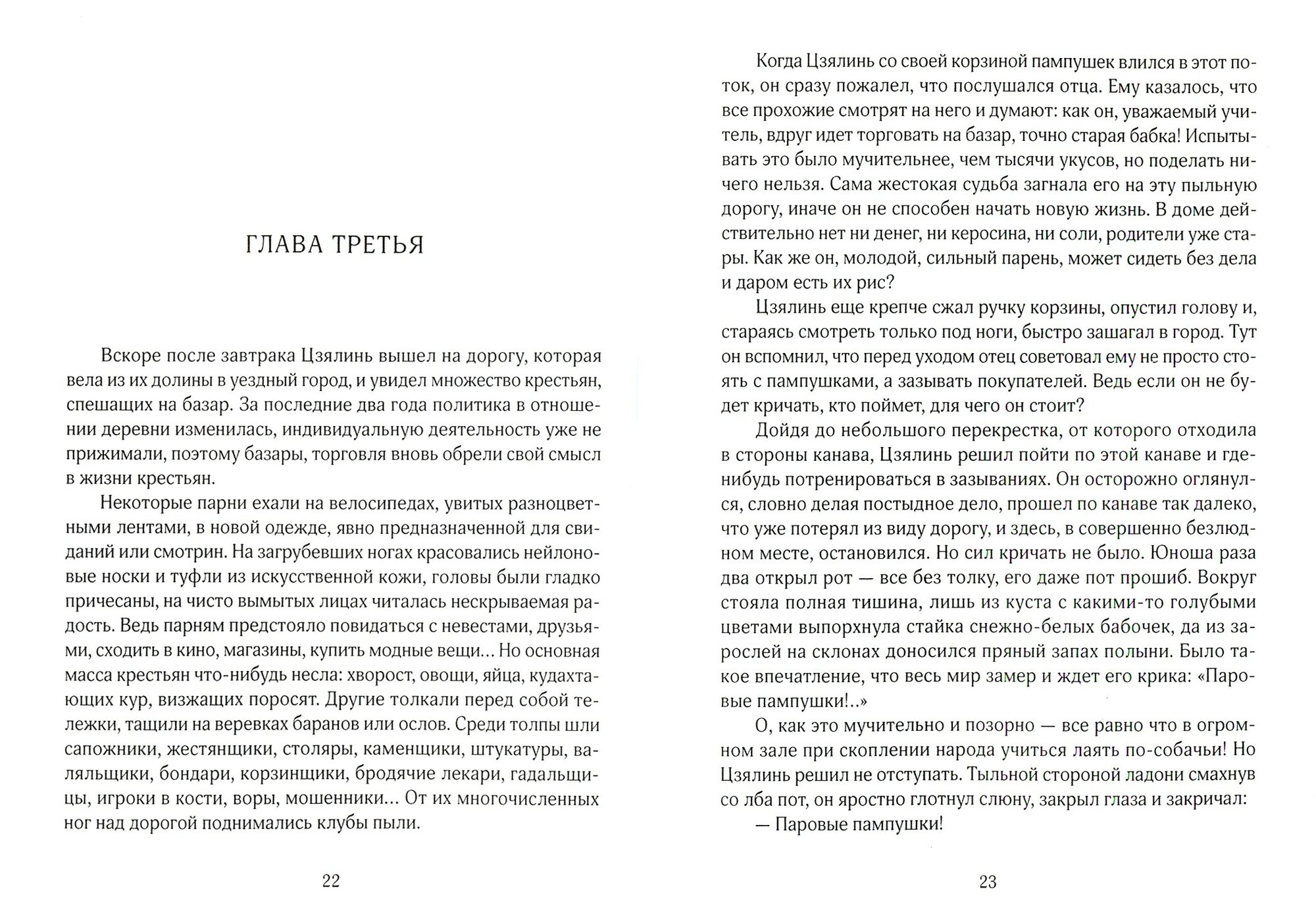 "Ещё через некоторое время показалась его деревня. Цзялинь невольно остановился и с грустью посмотрел на родные места. Всё в них было как прежде, но для него — совсем не как прежде. Люди, только что вышедшие на работу, вдруг с разных сторон устремились к нему. Он не мог понять, зачем они бегут, а они уже окружили его и начали расспрашивать. В их словах, взглядах, выражении лиц совсем не было неприязни или насмешки, напротив, они в один голос принялись утешать его:
