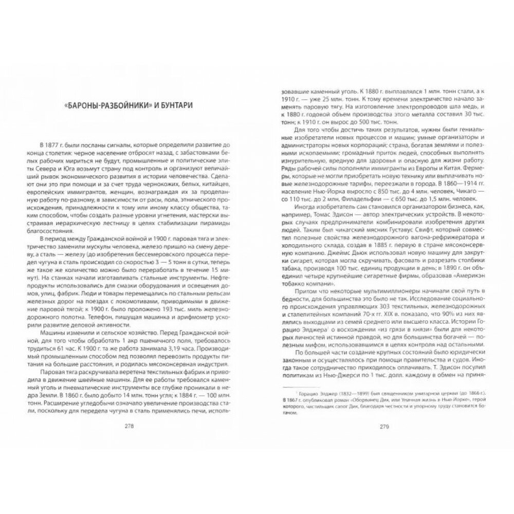 Действительно «другой взгляд». В книге хронология идёт не по сменяемости президентов или чему-то подобному, как в привычных книгах и учебниках по истории. Она в целом не похожа на книги, из которых можно почерпнуть набор базовых знаний, узнать, что и когда произошло. Автор разбирает страдания угнетённых народов / групп населения. То есть, к примеру, вся часть об открытии Америки и ее колонизации посвящена индейцам, глава про Гражданскую войну описывает не расстановку сил, события и т.д., а положение чернокожего населения, их бунты и проч.