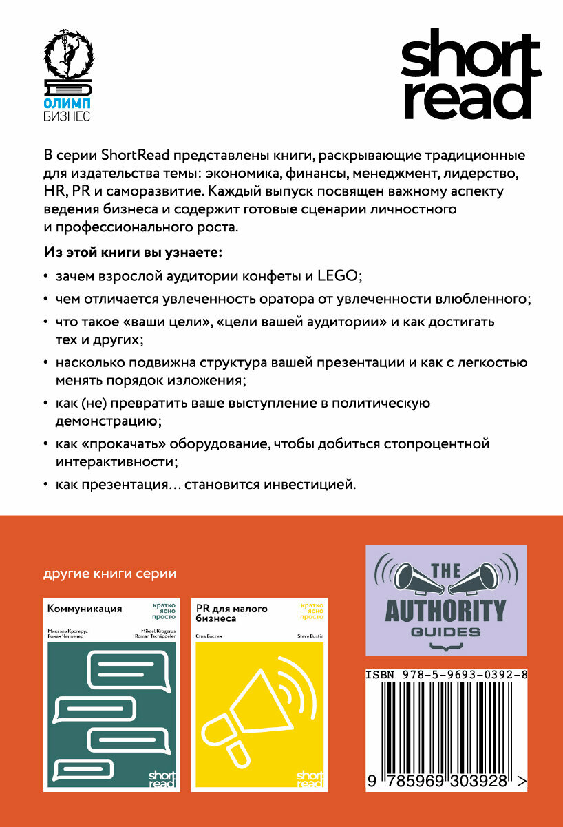 Последнее время приходится делать много презентаций, так что перелопатила кучу материала по данной теме всё громоздко, нудно и притом — везде вода. Когда наткнулась на эту книгу серии "ShortRead" с девизом на обложке "кратко, ясно, просто", подумала: да неужели! Решила проверить, и... книга себя оправдала на все сто!