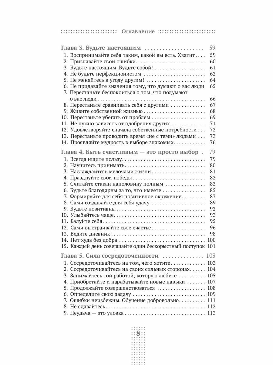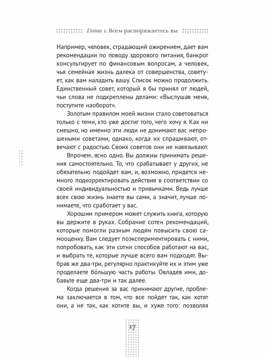 В этой книге вы найдете те самые сто практик, которые помогли Марку, а после — и сотням американских читателей. Главное, как считает автор, — понять, что ценность исходит не извне (от того, как вас оценивают другие), — а изнутри. В книге несколько частей. Первая посвящена тому, как люди видят вас. Вторая — тому, как вы видите сами себя. В третьей и четвертой рассказывается о вашем отношении к ошибкам и критике. А из пятой и шестой вы узнаете о пользе высокой самооценки для духовного и физического здоровья.