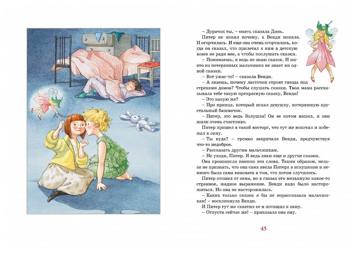 Детское чтение идёт сейчас семимильными шагами, но классика есть классика. Что посеешь, то и пожнёшь. Я стараюсь своему ребёнку чуть больше чем получила сама в детстве, упор делаю именно на классику. Хотя история о не желании взрослеть сейчас не очень актуальна. Современные дети слишком торопятся стать взрослыми. Выбирая из ряда современных изданий "Питера Пена" оставалась на данном. Во-первых, цена! Это не мало важно с учётом цен на книги. Во-вторых, исполнение ничем не хуже более дорогих изданий. Иллюстрации цветные, бумага не просвечивает. Понравилась идея с встроенной закладкой, очень удобно. Полутвёрдый обложка не смутила. Рекомендую!