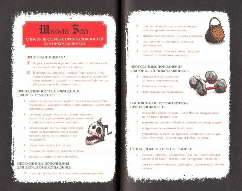 В "Путеводителе…" есть всё: школьная форма разных эпох, подробная карта Цветочного метро, школьные правила и дисциплинарные требования, меню столовой, избранные портреты наших выпускников и, конечно же, бестиарий! Ты узнаешь абсолютно обо всех секретах школы Добра и Зла!