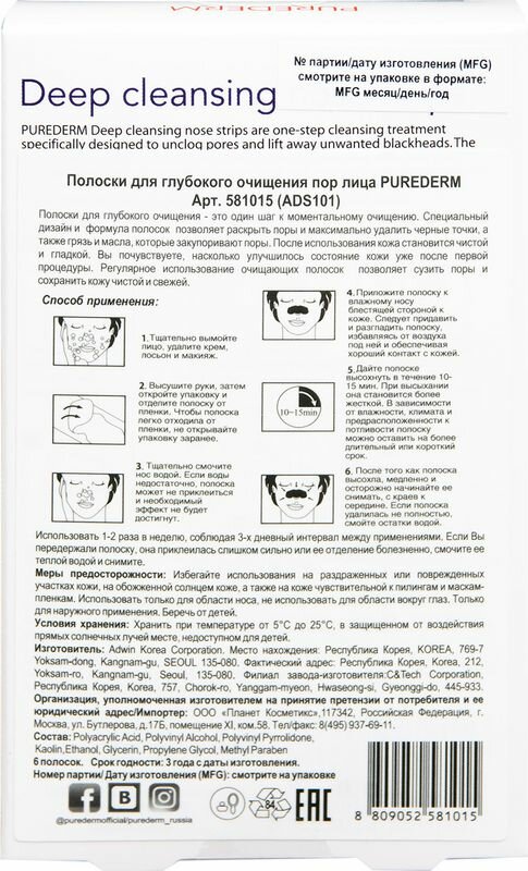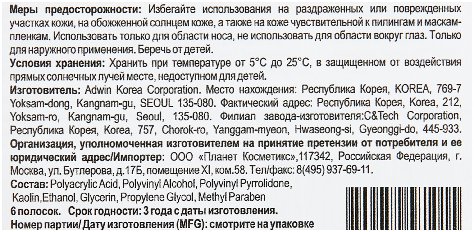 | Способ применения | Приложите полоску к влажному носу блестящей стороной к коже, разглаживая для плотного прилегания. Выдержите 10-15 минут, затем аккуратно снимите. Используйте с интервалом 3 дня 1-2 раза в неделю. |
