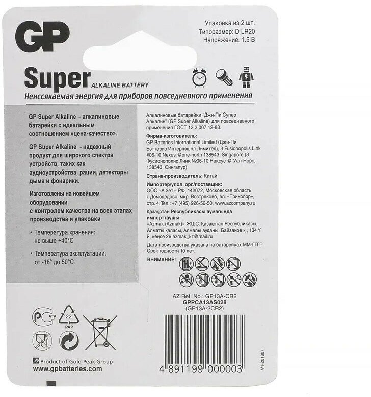 Батарейка алкалиновая GP 13A D предназначена для использования в разнообразных изделиях с высоким уровнем токопотребления (плееры, фотовспышки, детские электронные игрушки, фонарики). Этот элемент питания абсолютно безопасен, поскольку при его изготовлении не применялись ртуть и кадмий, а были использованы только экологически чистые материалы. Данный элемент питания значительно превосходит по работоспособности и электроемкости своих солевых собратьев.