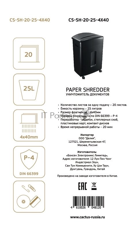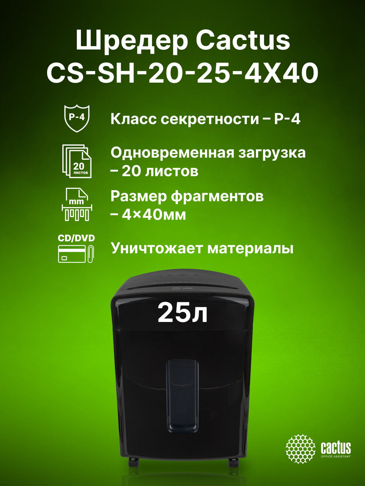 Уничтожитель бумаг CACTUS P-4 4х40 мм CS-SH-20-25-4X40