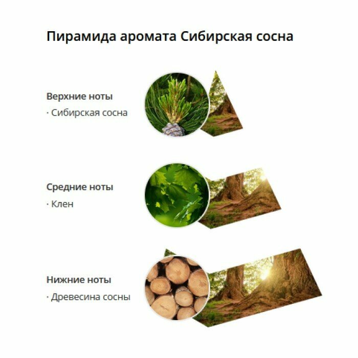 Натуральный хвойный аромат сибирской сосны. Как будто кто-то рядом с вами взял и растер в ладонях шишки и сосновые иголки, а вы вдруг сделали глубокий вдох и услышали этот благородный аромат.