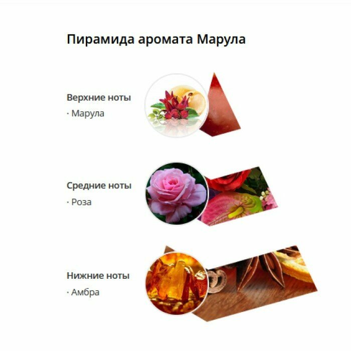 Насыщенный аромат марулы и королевской розы с нотами бергамота, ягод перечного дерева, лилии и фрезии.