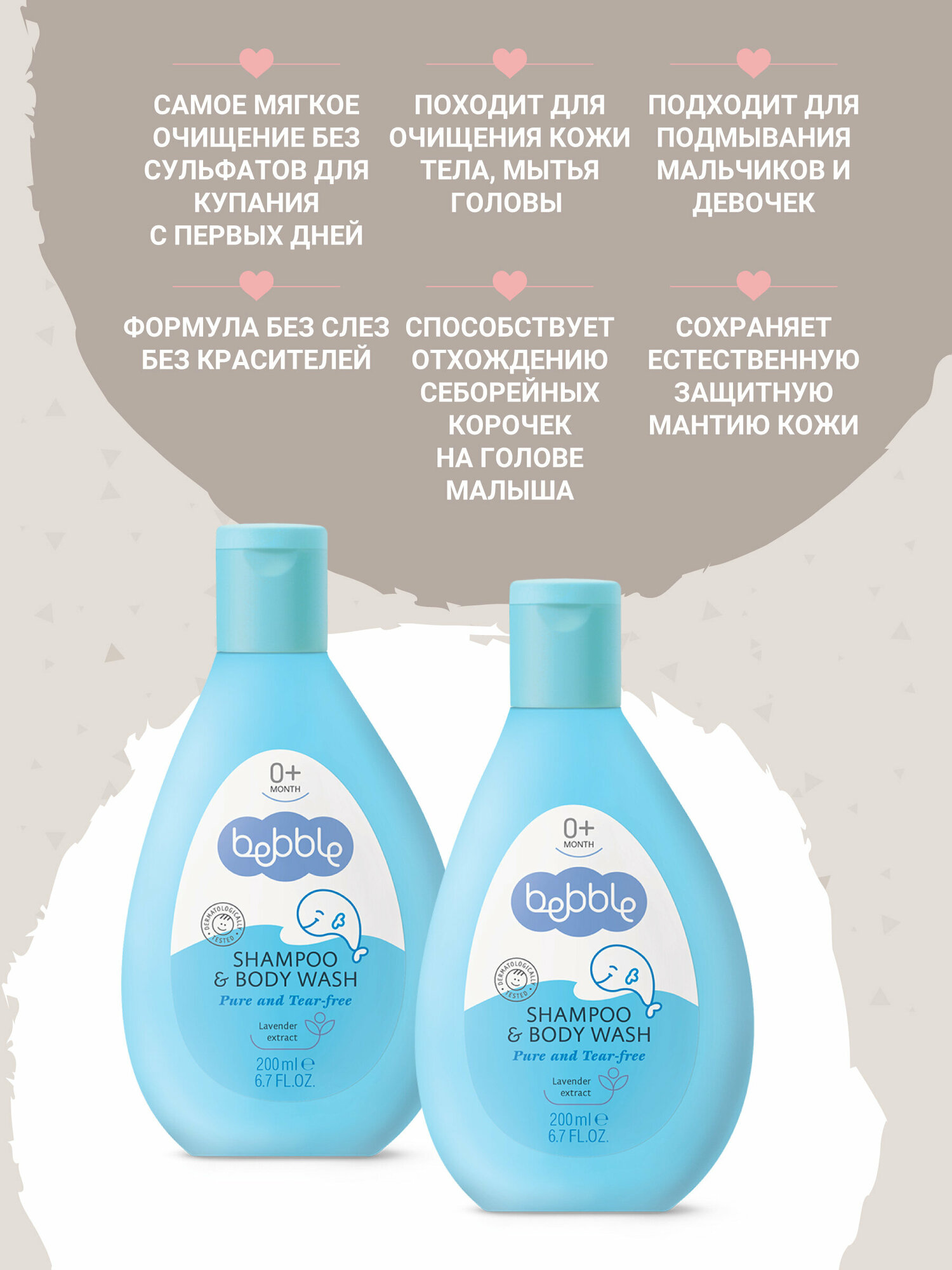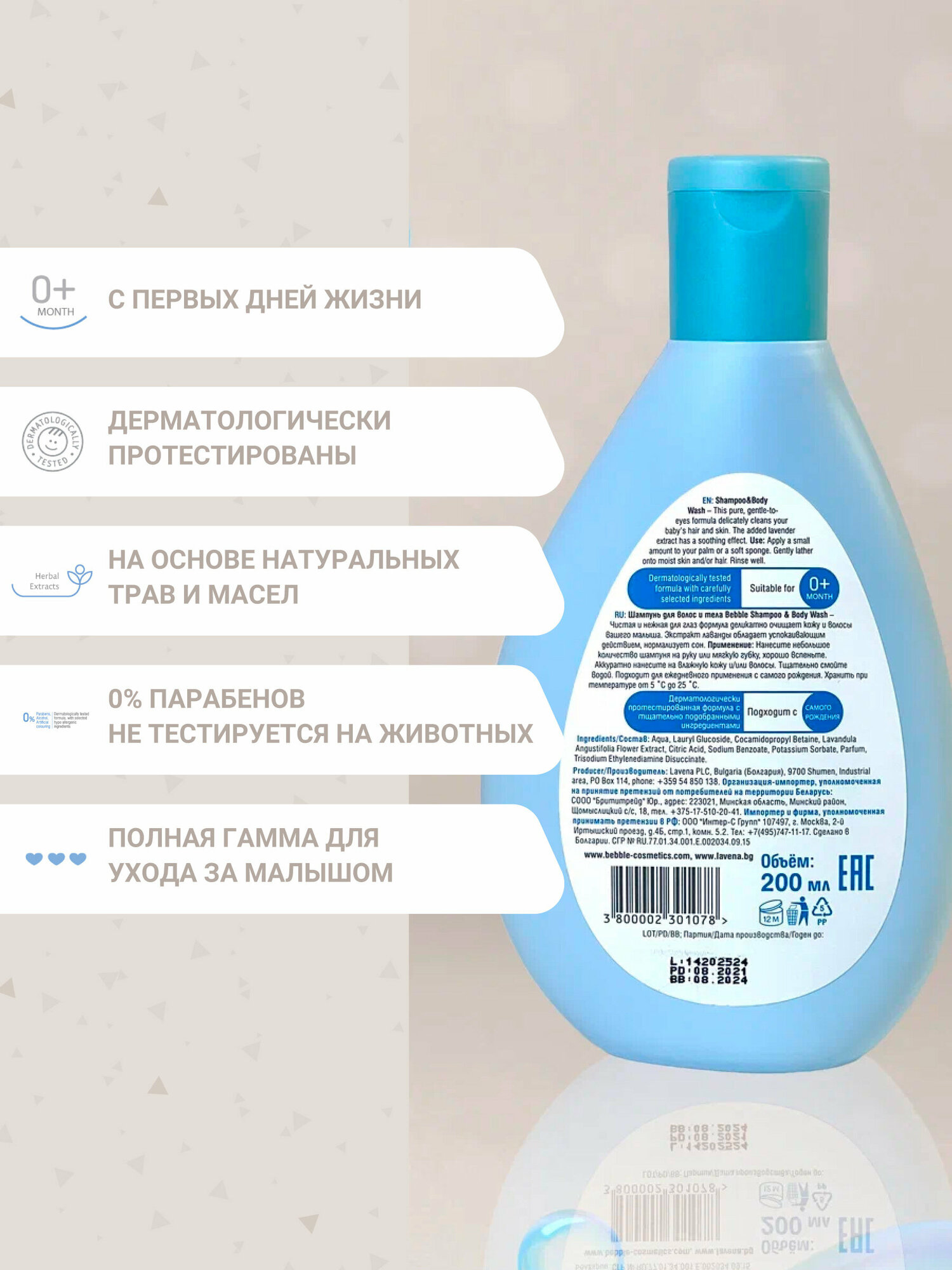 День, проведенный с малышом — это день, наполненный любовью. Tеплая расслабляющая ванна с шампунем для волос и тела bebble представляет собой лучший способ окончания дня. Мягкая формула, специально разработанная для малышей, особенно нежна для глаз. Пушистая пенка шампуня деликатно очищает волосы и кожу, не иссушая их. Добавленный экстракт лаванды обладает успокаивающим и антисептическим действием. Благодаря этому шампуню время купания малыша превратится в твое любимое время дня. Природные и активных ингредиентов в этой Bebble продукта: Экстракт лаванды обладает антисептическими, противомикробными и мягкообезболивающими свойствами. Стимулирует рост здоровых клеток, помогает снять отеки и балансирует содержание влаги на коже.