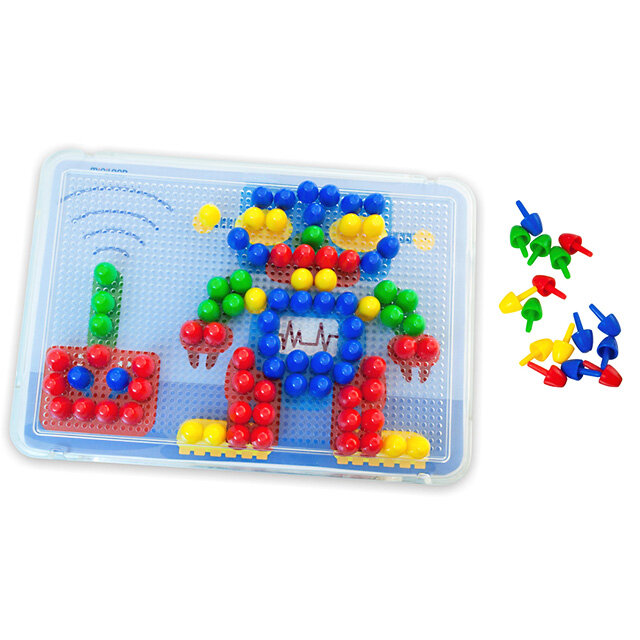 Мозаика 15 мм. Особенностью этой мозаики является прозрачная основа, которая позволяет помещать под ней карточки-картинки и копировать их с помощью фишек. Ребенку дается полная свобода воображения - можно составлять мозаичные картины со своими картинками, или вообще без них. Ребенок учится согласованности движений, тренирует усидчивость, развивает абстрактное и пространственное мышление. Детали изготовлены из экологически чистой пластмассы. В комплекте 160 фишек размером 15 мм, прозрачная основа с отверстиями и 6 картинок. Рекомендованный возраст: от 3 до 6 лет