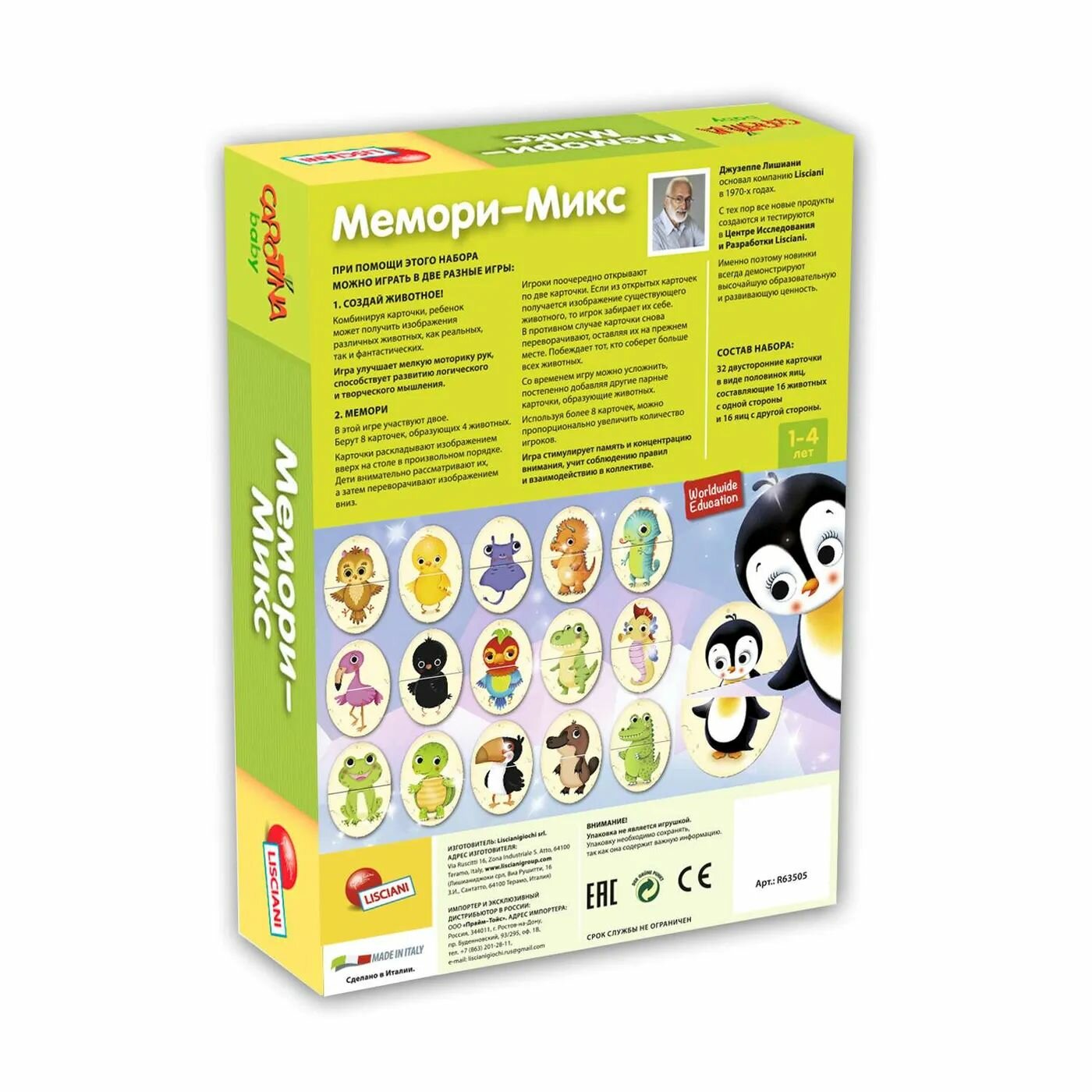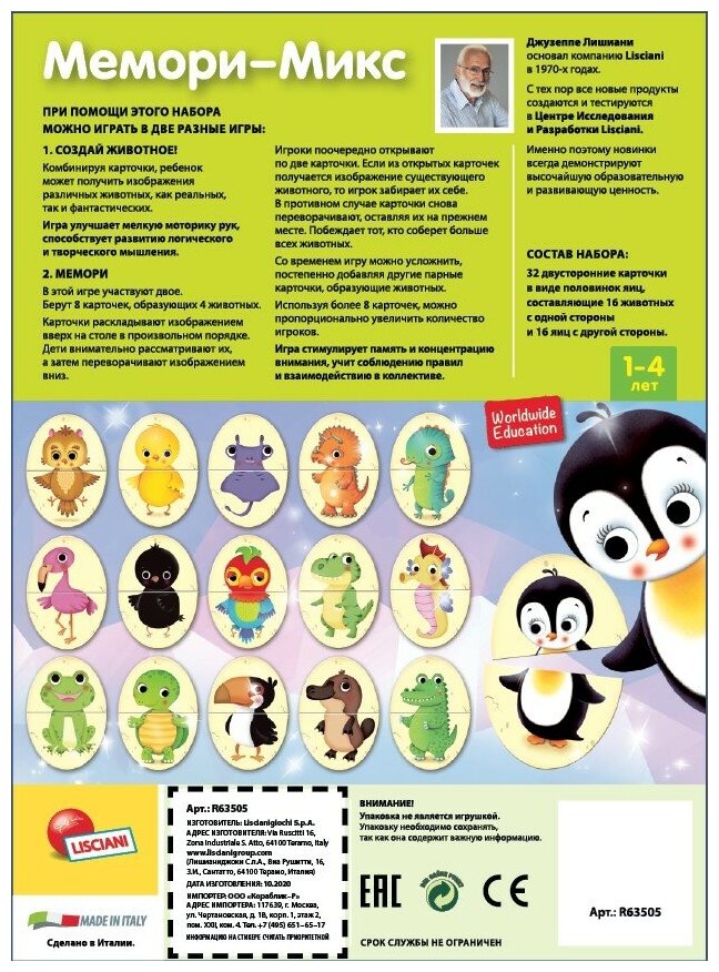 Мемо-Микс - увлекательный набор из трех игр: Игра-паззл Собери яйцо, Игра Мемори, Лото. В процессе игры дети знакомятся с детенышами животных, которые вылупляются из яиц. Ребенок может комбинировать карточки по своему желанию, создавая фантастических животных. Еще один вариант игры - игра на внимательность. Ребенку предлагается запомнить собранные взрослым пары карточек и, после того как он отвернется, а взрослый поменяет их местами, вернуть их на прежнее место. Игра способствует развитию памяти и внимания, мелой моторики, логики, творческого воображения, расширению кругозора.