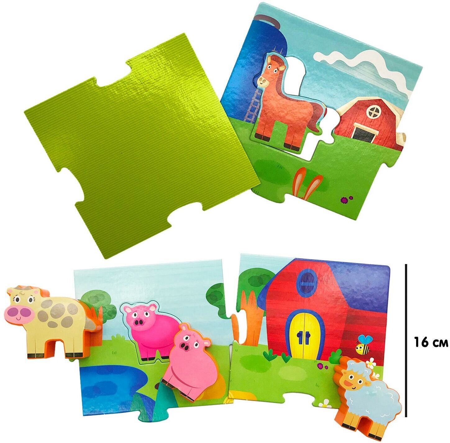 Паззл с объемными пластиковыми 3D-фигурками животных и красочными иллюстрациями. Собирая большой паззл, на месте контурных изображений животных ребенок размещает их объемные пластиковые фигуры с наклейками, в процессе игры изучая животных фермы или джунглей. Пластиковые фигурки животных можно также использовать как формочки для песка или в качестве трафарета - обводить на листе бумаги, а затем раскрашивать. Игра тренирует навыки распознавания контуров, форм и их соотношений с соответствующими животными, развивает логику и мелкую моторику.