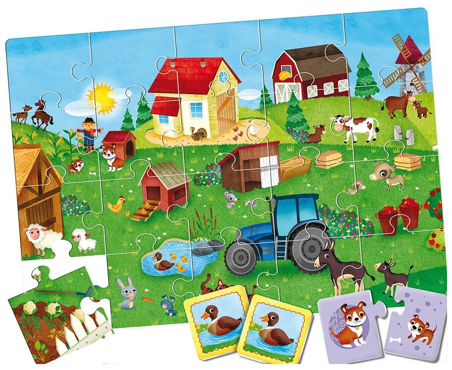 Набор состоит из трех игр: Паззл, логическая игра, и мемори. Паззл состоит из 20 элементов в собранном виде оразует поле в 25 х 35 см. 12 карточек для логической игры и 12 карточек мемори.