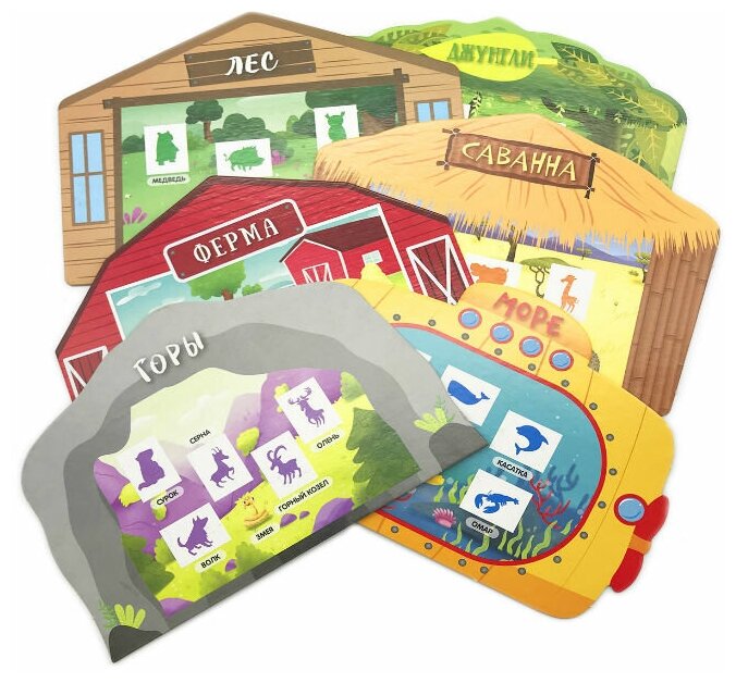 Познавательное лото. Малыш познакомится с шестью местами обитания животных и зверятами, которые их населяют. На ярких карточках изображены силуэты животных и их названия. Таким образом, ребенок учится узнавать их по форме и соотносить слово с соответствующими животными. Игра развивает внимательность, формирует знания об окружающем мире.
