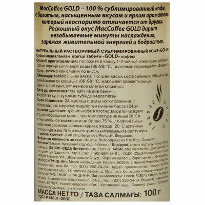 Кофе натуральный MacCoffee Gold растворимый сублимированный 100г. Кофе натуральный растворимый сублимированный MacCoffee Gold, в стеклянной банке. MacCoffee Gold - 100% сублимированный кофе с богатым, насыщенным вкусом и ярким ароматом, который неоспоримо отличается от других. Роскошный вкус MacCoffee Gold дарит незабываемые минуты наслаждения, заряжая живительной энергией и бодростью. Способ приготовления: положите в чашку 1-2 чайные ложки кофе, добавьте 150мл горячей кипяченой воды (96-98)'С, тщательно перемешайте. Добавьте сахар, молоко или сливки по вкусу.
