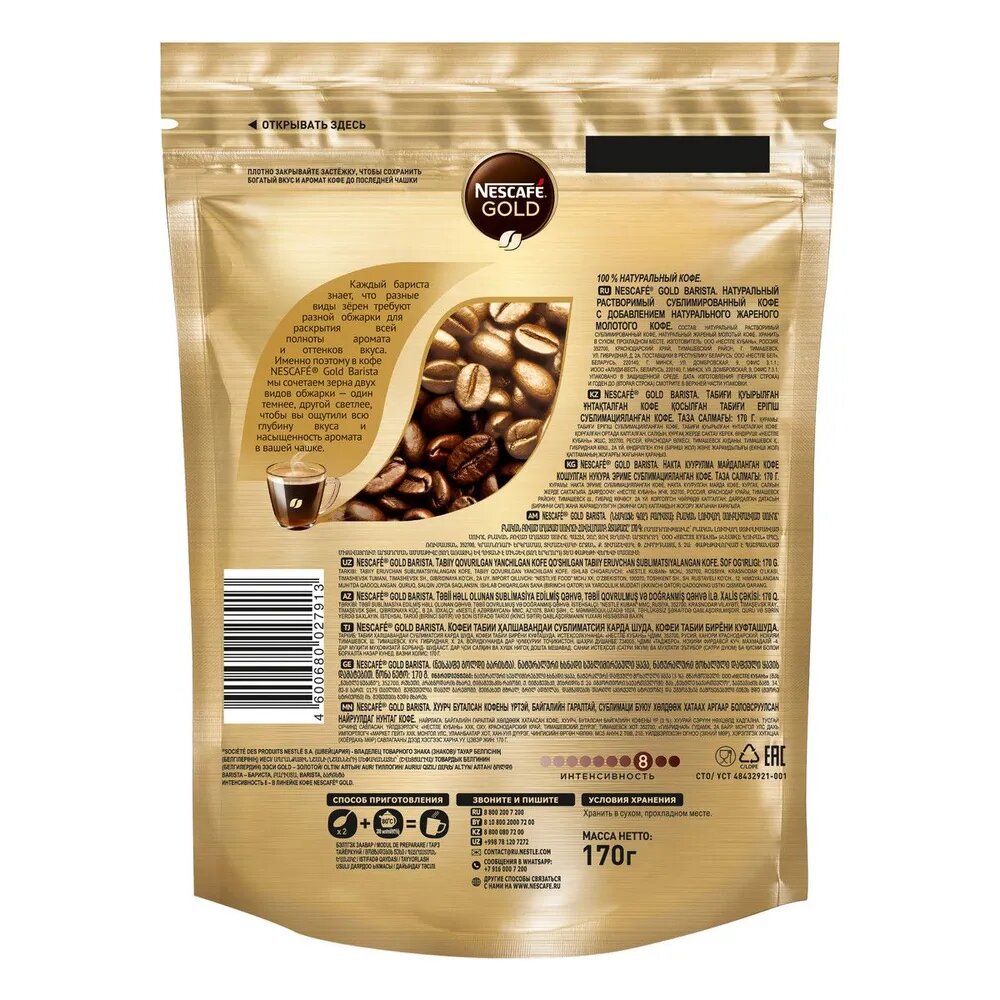 Каждый Бариста знает, что разные виды зёрен требуют разной обжарки для раскрытия всей полноты аромата и оттенков вкуса. NESCAFÉ Gold Barista - это два вида кофе, которые по-разному обжариваются, чтобы раскрыть лучшие качества каждого. Светлая обжарка Арабики раскрывает мягкий, сочный вкус с тонкими фруктовыми нотами в аромате. А тёмная обжарка кофейных зёрен - для глубокого вкуса с карамельным оттенком. В результате получается напиток с еще более насыщенным вкусом и ярким ароматом. Как профессиональный бариста, новый NESCAFÉ Gold Barista удовлетворяет самый взыскательный вкус.
