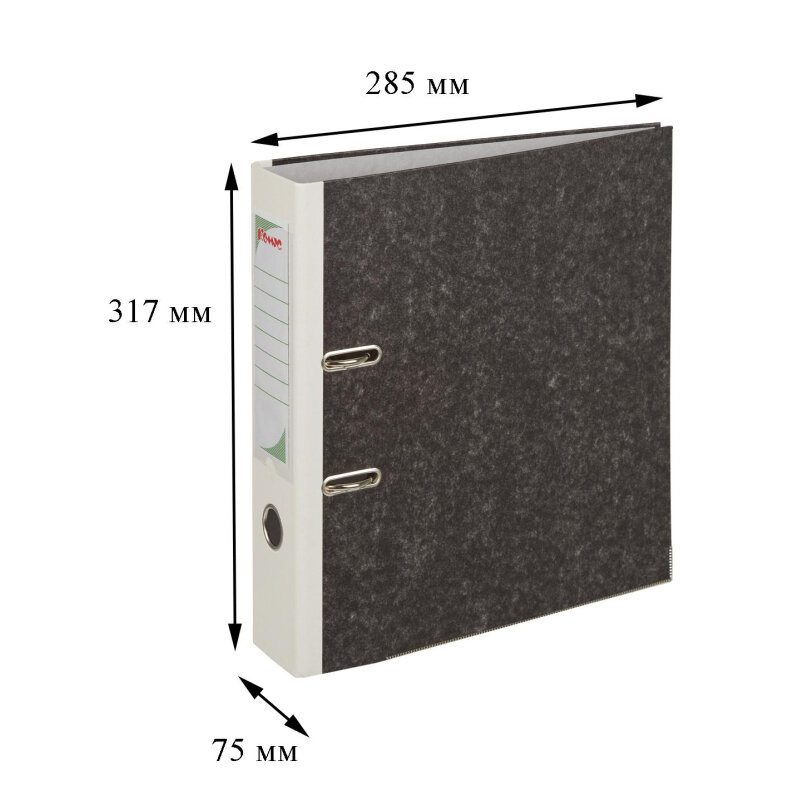 Папка-регистратор с арочным механизмом формата А4 изготовлена из плотного картона, покрытого фактурной бумагой под мрамор. Нижние края защищены металлическим кантом. Корешок — бумвинил, желтого цвета, ширина корешка 75 мм. На корешке имеется карман со сменной этикеткой и кольцо для захвата. Папка-регистратор вмещает до 480 листов стандартной плотности.