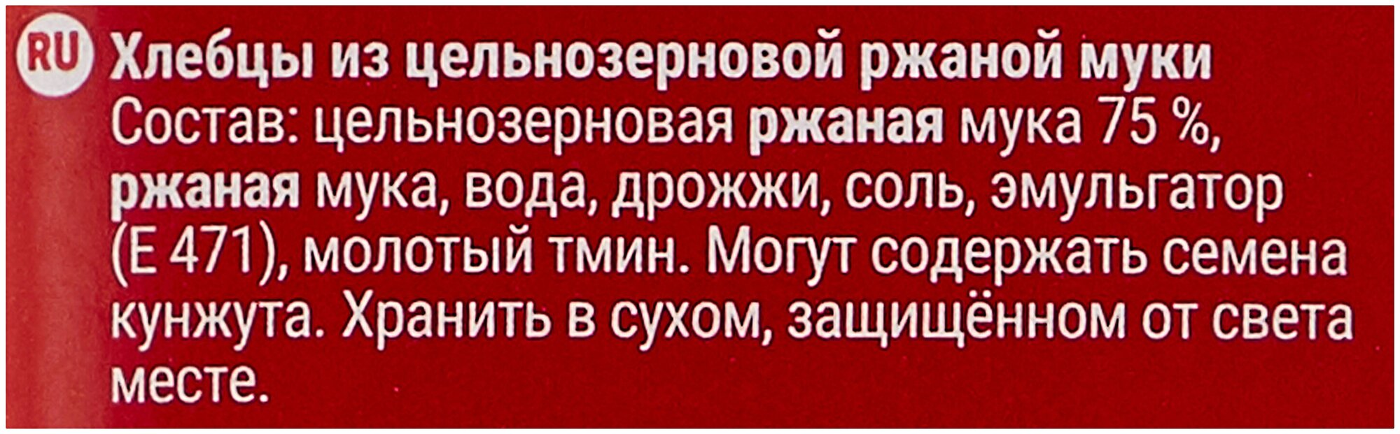 | Состав | Цельносмолотая ржаная мука 75%, ржаная мука, соль, эмульгатор Е471, молотый тмин, вода, дрожжи. |