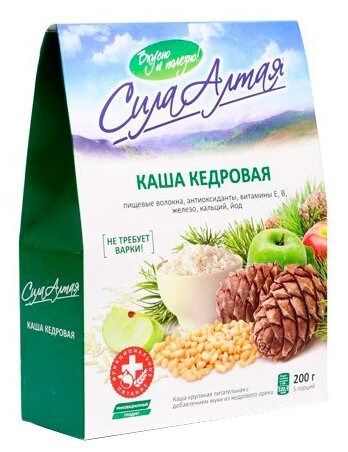 Не многие знают, что полноценный завтрак – это залог прекрасного самочувствия, крепкого здоровья и нормальной массы тела. Утро нужно начинать с неплотного и насыщенного завтрака, чтобы организм проснулся и начал вырабатывать энергию, необходимую для полноценной жизни. Многие игнорируют завтрак, а это неправильно – это скажет каждый врач-диетолог. Начинать утро с вкусной и полезной кедровой каши – это то, что нужно и взрослым, и детям. Кедровая каша – это не только великолепный вкус, но и польза для организма. Кедровая каша – это бодрость: ценные витамины и легкоусвояемые белки каши заряжают энергией. Кедровая каша – это очищение: растительная клетчатка каши помогает снизить уровень холестерина в крови, очистить кишечник и нормализовать обменные процессы организма. Кедровая каша – это насыщение: одной порции каши достаточно для полноценного и полезного завтрака взрослого человека. Кедровая каша не содержит ГМО и вредные для здоровья химические элементы, красители и усилители вкуса. Это полноценный источник пищевых волокон, антиоксидантов, витаминов Е, В, железа, кальция и йода. Кедровая каша – это идеально сбалансированный продукт для здоровья. Она легко усваивается организмом и обладает рядом ценнейших свойств: Белок кедрового ореха содержит в большом количестве природный антиоксидант витамин Е, а также комплекс витаминов В, благотворно воздействующих на нервную систему. Кроме того, кедровый орех содержит незаменимые омега-3 и омега-6 полиненасыщенные жирные кислоты. Сильнейший белок кедрового ореха содержит в больших количествах метионин, который улучшает работу печени и поджелудочной железы, триптофан, который улучшает настроение и лизин, который необходим для выработки коллагена, обеспечивающего упругость и гладкость кожи и хорошее состояние суставов. Клетчатка, содержащаяся в каше в большом количестве, наделяет ее замечательным свойством очищать кишечник от шлаков и токсинов. Регулярное употребление каши улучшает моторику кишечника, устраняет проблемы пищеварения, препятствует развитию дисбактериоза. Клетчатка препятствует усвоению сахара и способствует понижению его уровня в крови. Поэтому она полезна для профилактики развития сахарного диабета. Клетчатка выполняет функцию «метлы» в кишечнике, вычищая застоявшиеся продукты обмена. Благодаря клетчатке можно скорректировать свой вес – клетчатка помогает ускорить метаболизм, тем самым не позволяя лишним килограммам оседать на фигуре. Особо полезной кедровую кашу делает содержание в ней минеральных веществ: магний и калий - для нормальной работы сердца и регуляции артериального давления, железо - для создания кислородного запаса в организме, фосфор - для нормального роста и поддержания целостности костной и зубной тканей. Регулярное употребление кедровой каши повышает защитные силы организма, укрепляет иммунную систему, помогает сохранять красоту и молодость. Кедровая каша содержит в значительном количестве.