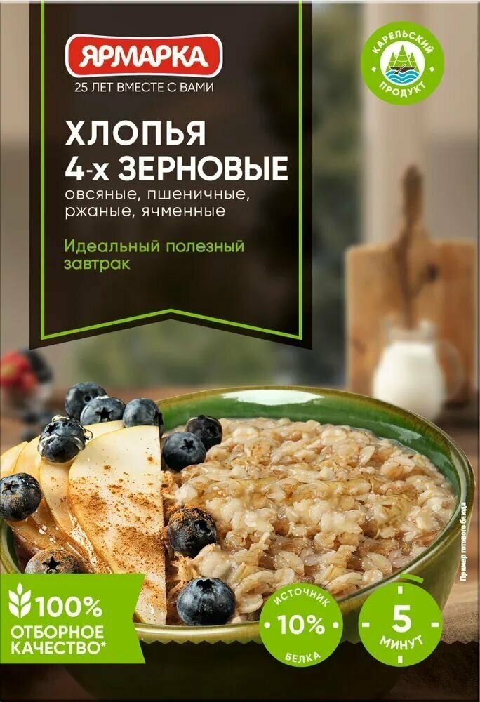 4х зерновые хлопья вырабатываются из отборных зерен овса, пшеницы, ржи и ячменя. Удачное сочетание четырех видов злаковых хлопьев не только придает готовому продукту оригинальный вкус, но и обеспечивает более сбалансированный состав питательных веществ. Полезное и вкусное сочетание 4х видов злаковых хлопьев зарядит энергией на целый день. 4х зерновые хлопья «Ярмарка» - это сбалансированный, полезный и питательный завтрак для всей семьи! Можно использовать для приготовления каш, гарниров, заправки супов.