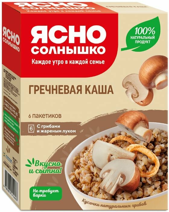 Моментальная порционная гречневая каша имеет сбалансированную рецептуру, рассчитанную на одну порцию. Натуральные сублимированные грибы, входящие в состав каши, быстро восстанавливаются при заваривании, отдавая гречневым хлопьям свой аромат, а жареный лук придаёт каше завершённый вкус.