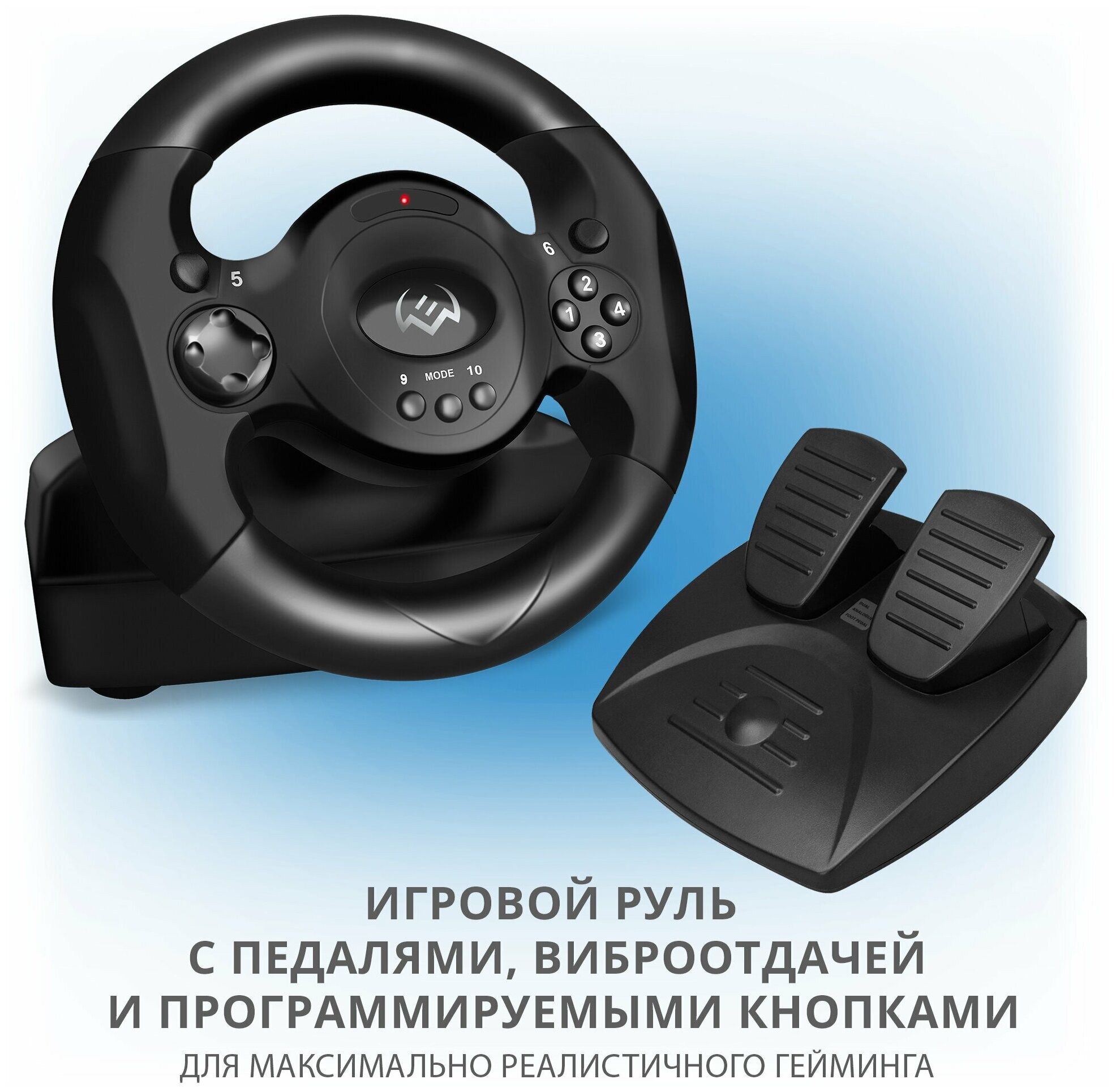 | Особенности | Эргономичный руль для игр, Диаметр руля – 9" (225 мм), Угол поворота – 180 градусов, Поддержка: DirectX 7.0 и выше, Windows XP/Vista/7/8/10, Интерфейс USB, , Функция виброотдачи и встроенный вентилятор для повышения реалистичности, , Две оси, 8-позиционный джойстик и 10 дополнительных кнопок, Резиновые вставки в руле для комфортного вождения, Резиновые присоски для надежной фиксации к столу, Работа в цифровом и аналоговом режимах, Педали в комплекте |