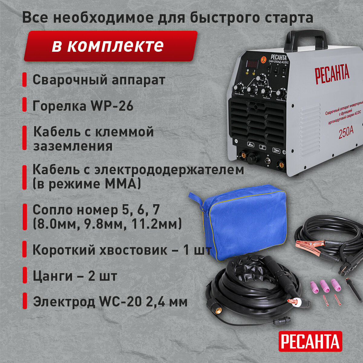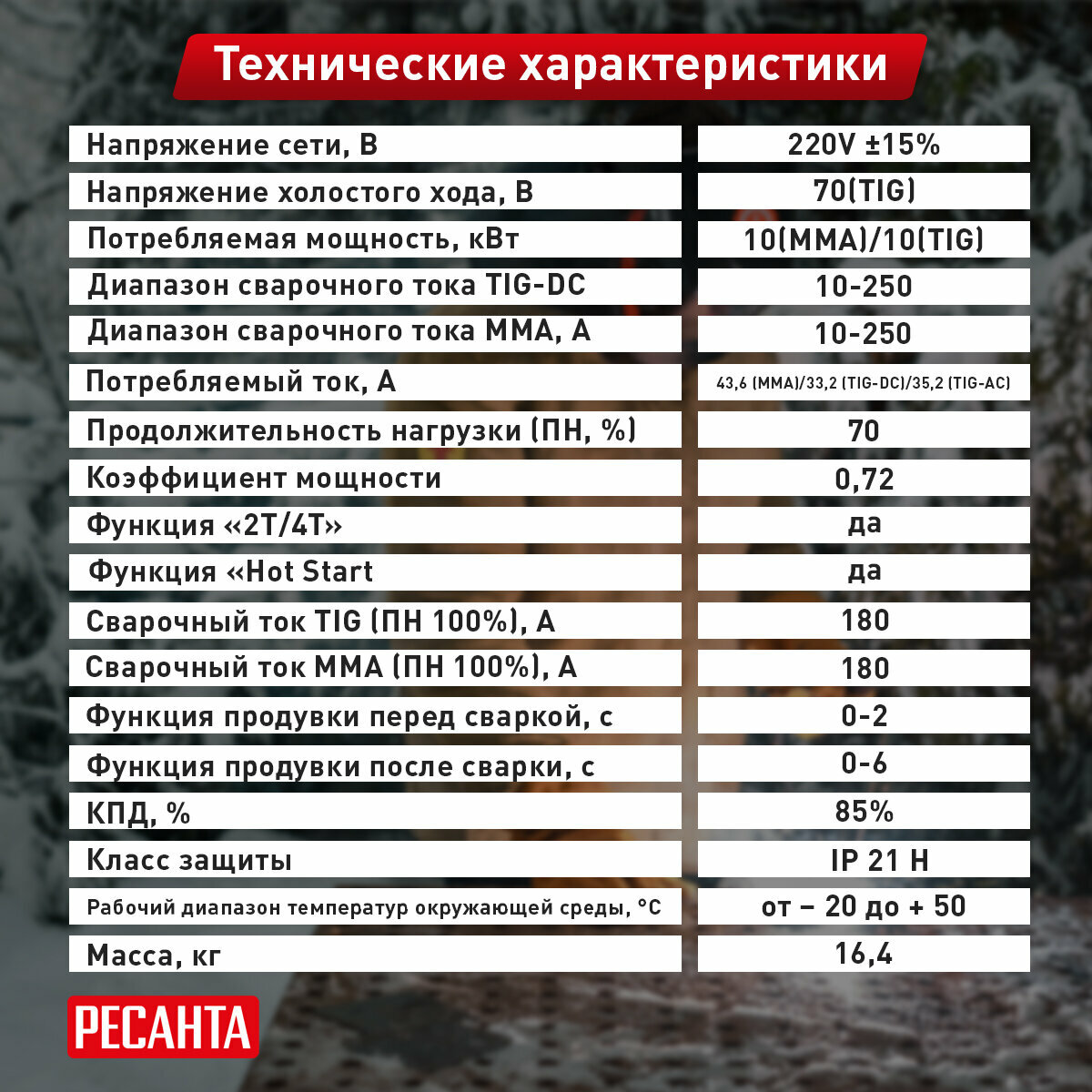 - Сварочный ток TIG, A: 10-250