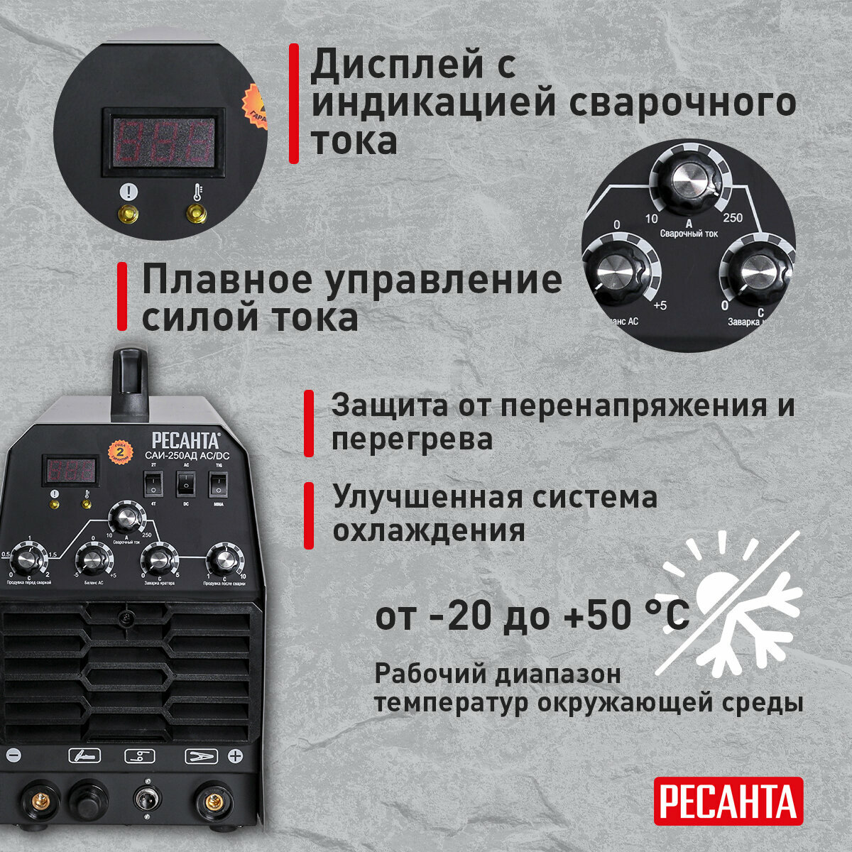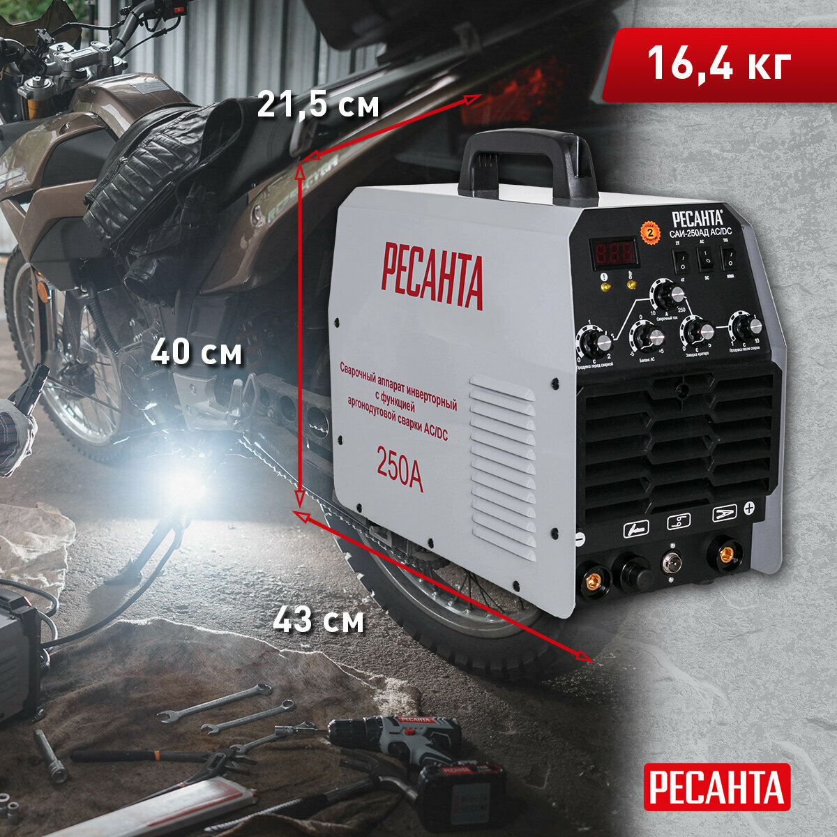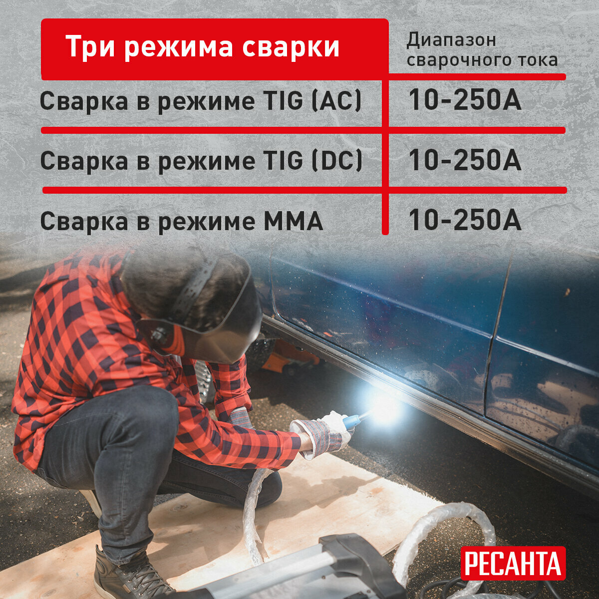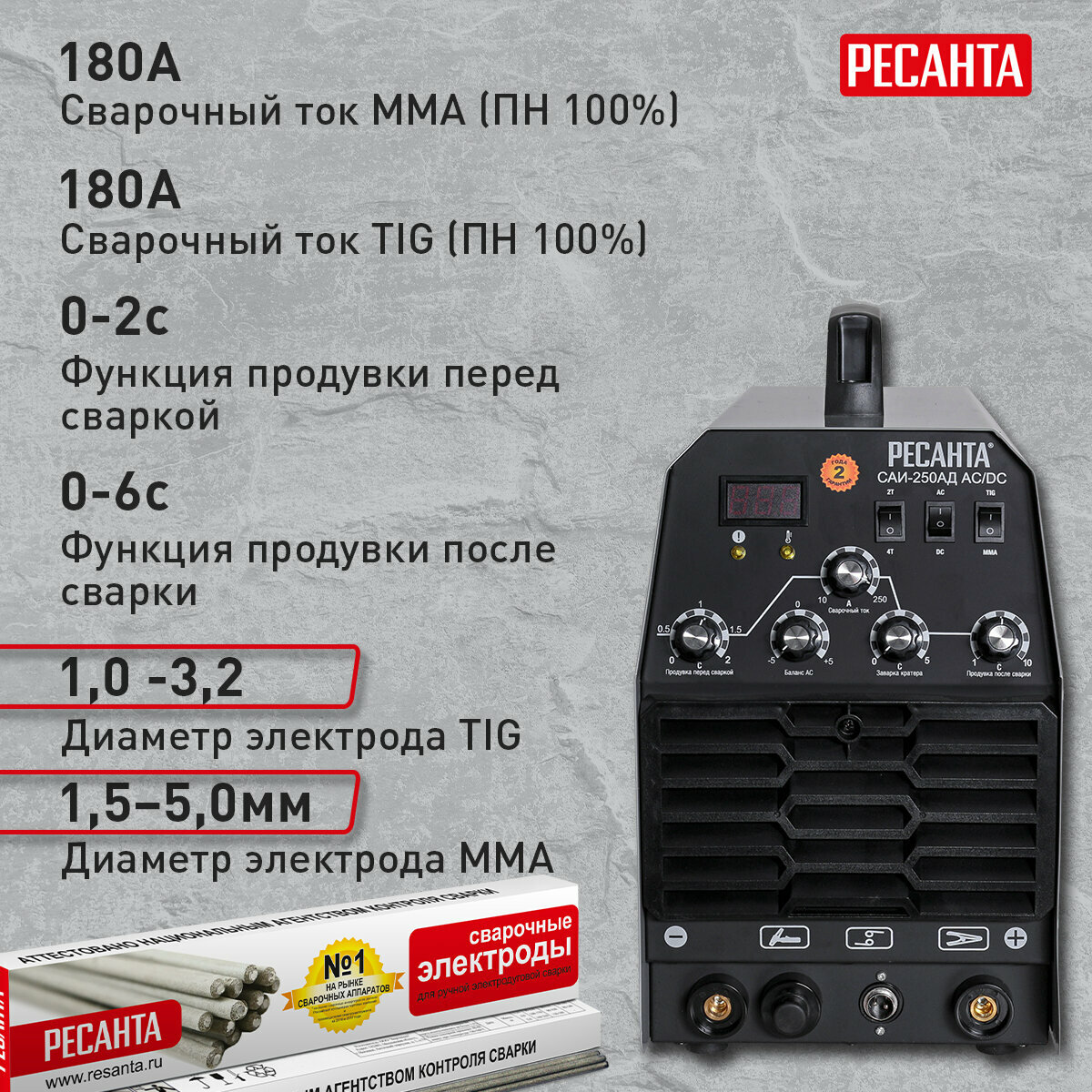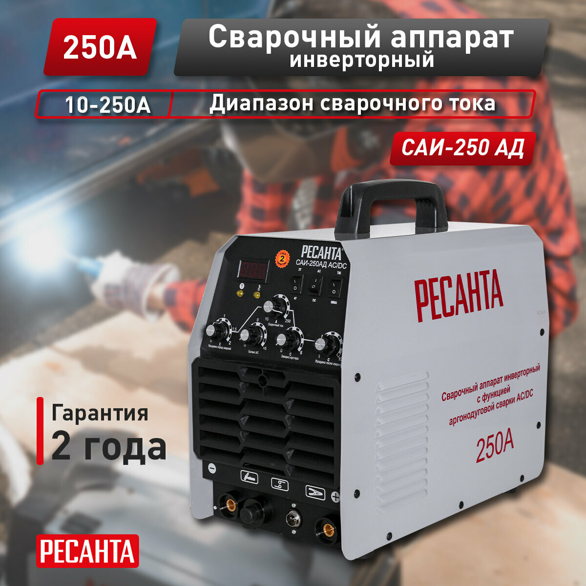 Сварочный аппарат Ресанта САИ-250-АД, методы сварки: ММА DC, сварочный ток от 15A до 250A (65/59)
