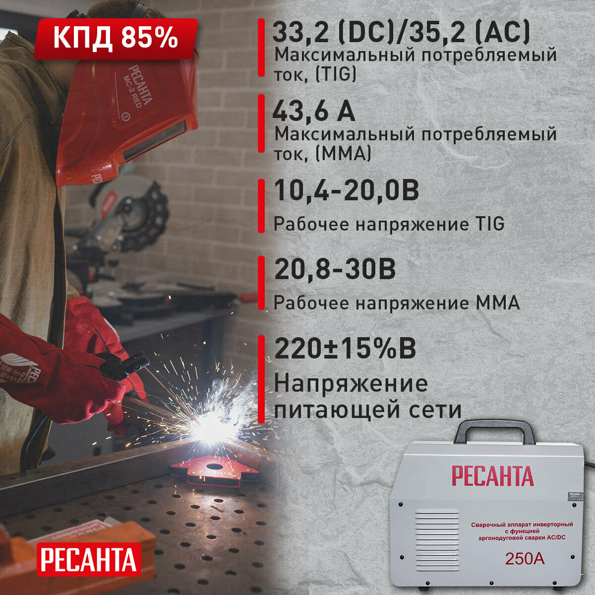 - Потребляемый ток, А: 43,6 (ММА)/33,2 (TIG-DC)/35,2 (TIG-AC)