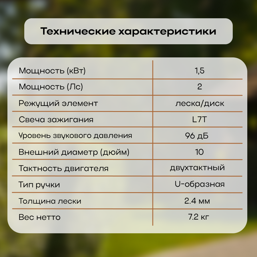 | Оснащение | защитный кожух,защитные очки,диск,катушка с леской,емкость для смешивания топлива,ранцевый ремень |