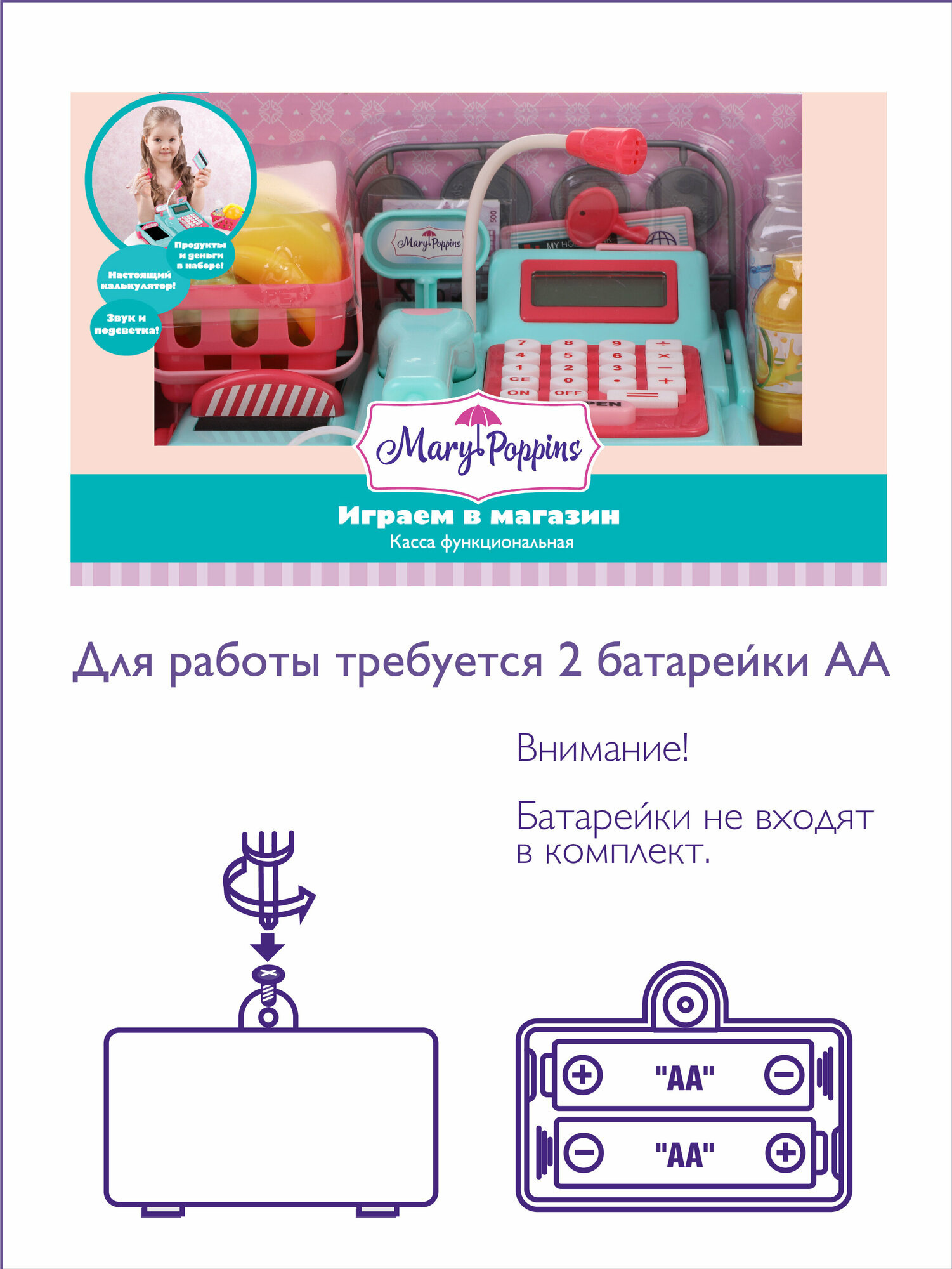 Касса «Играем в магазин» от ТМ Mary Poppins придумана для увлекательной сюжетно-ролевой игры, в процессе которой ребёнок будет развивать коммуникативные навыки и воображение. Игрушка оснащена настоящим калькулятором. Отделение для денег открывается с помощью кнопки OPEN и закрывается на ключ. Сканер реалистично пикает и подсвечивается при нажатии на кнопку. Кассовую ленту можно двигать при помощи специального рычага. Если провести картой по магнитному считывателю - вылетит табло. В наборе прилагаются игрушечные деньги и продукты. Включается и выключается при помощи кнопки ON/OFF.