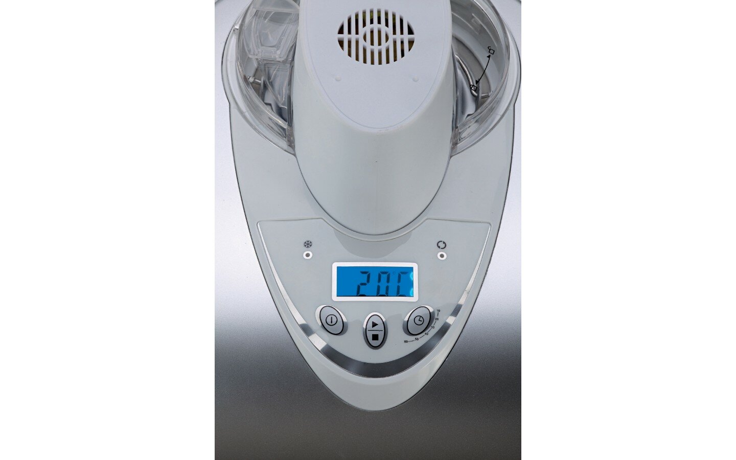 Особенность этой модели в том, что она с компрессором. В отличие от моделей, в которых чашу надо заранее охлаждать в морозильной камере не менее суток, эта мороженица в любой момент может приступить к приготовлению вашего любимого лакомства. Управление прибором производится при помощи кнопок на верхней панели: кнопка включения прибора, кнопка управления таймером, кнопка старт/пауза. Показания таймера и термометра выводятся на ЖК-дисплей. Стандартное время приготовления – 20-40 мнут. Объем чаши – 1 л. Это значит, вы сможете приготовить до 700 мл мороженого. Через 10-15 минут после финиша можно вновь начинать готовить мороженое. Например, добавив другие ингредиенты для получения нового вкуса.